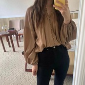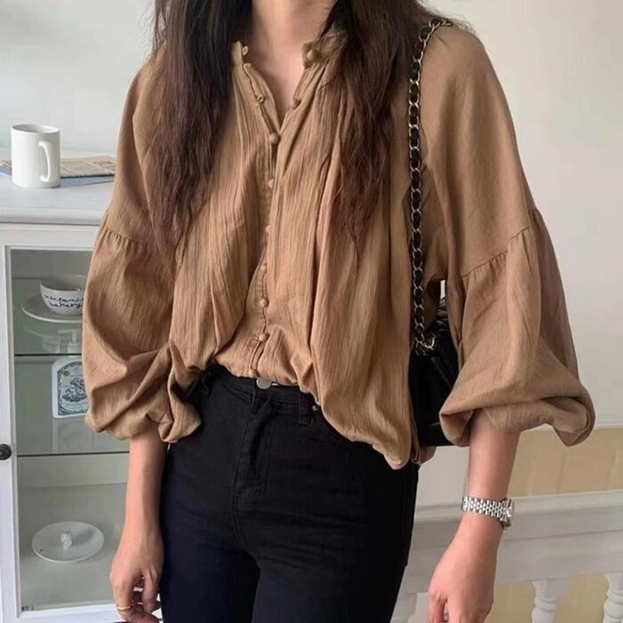 全2色 大きいサイズ シンプル トップス シャツ ブラウス プルオーバー パフスリーブ レディース エレガント きれいめ カジュアル 長袖 大人 可愛い フェミニン ゆったり ナチュラル キーネック 体型カバー ブラウン ホワイト 白 春 夏 秋 20代 30代 40代 50代