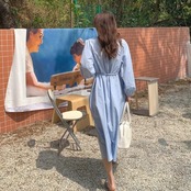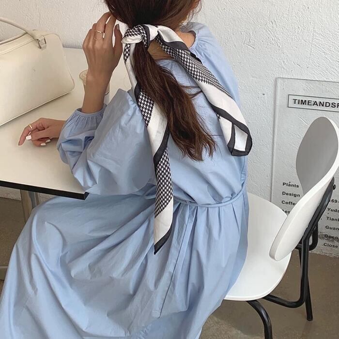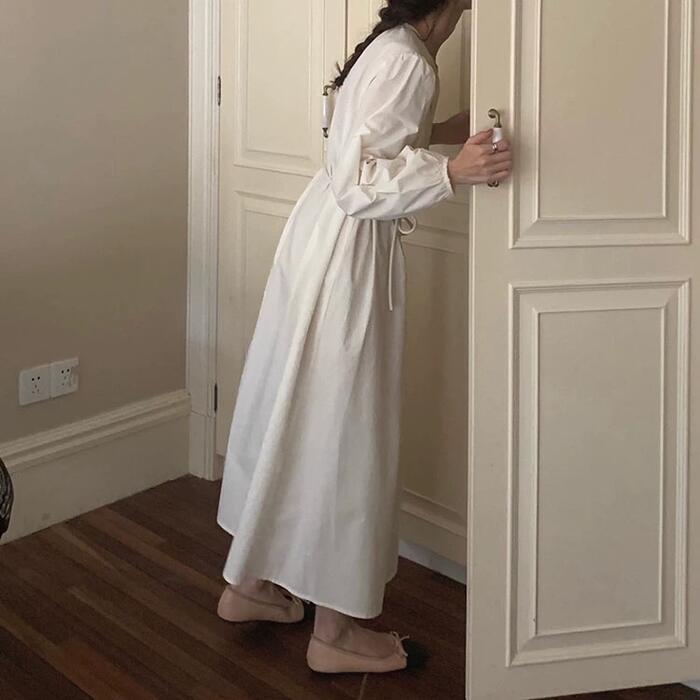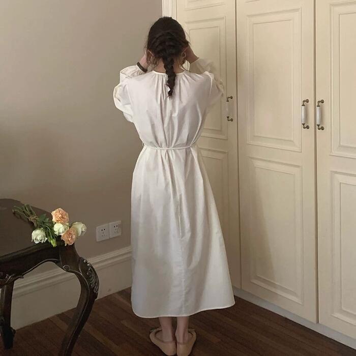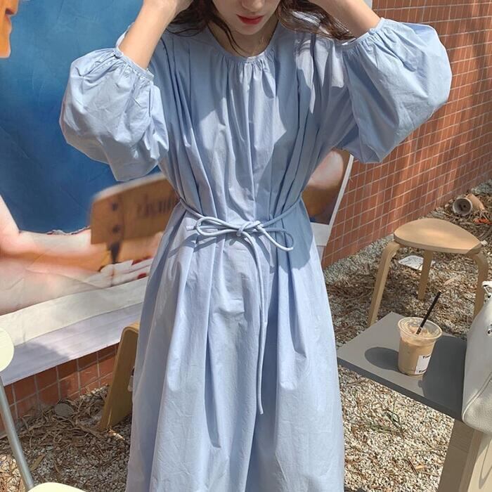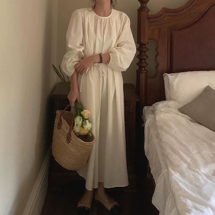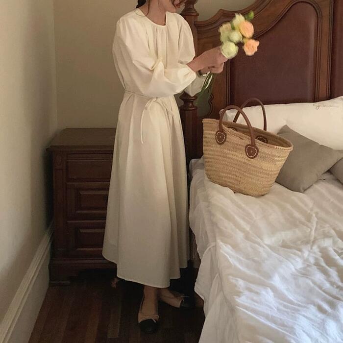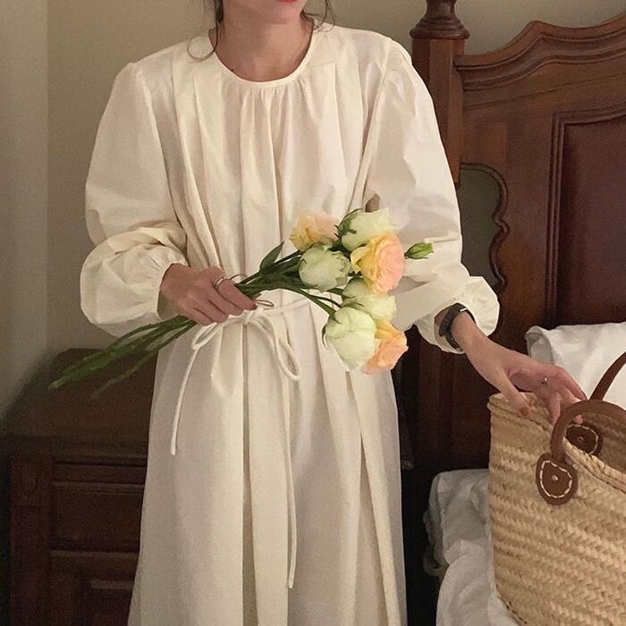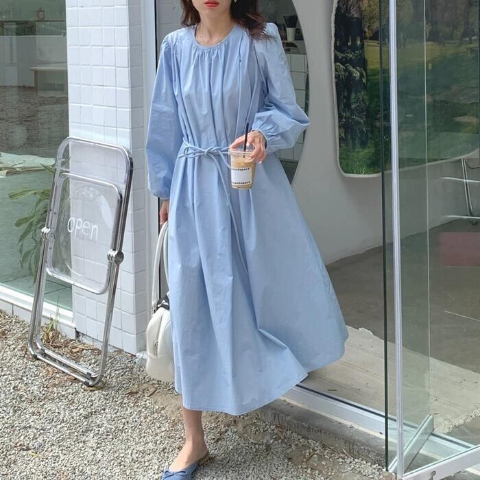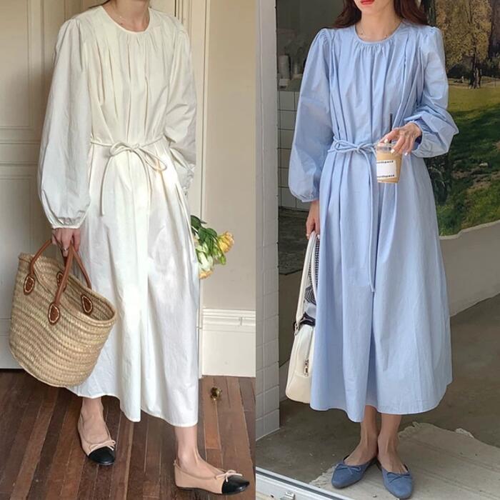 全2色 パフスリーブ ワンピース ドレス 袖あり レディース エレガント きれいめ カジュアル ミモレ丈 長袖 大人 可愛い フェミニン ウエストリボン ゆったり 体型カバー 韓国 シンプル ナチュラル ホワイト 白 ブルー 青 春 夏 秋 20代 30代 40代 50代