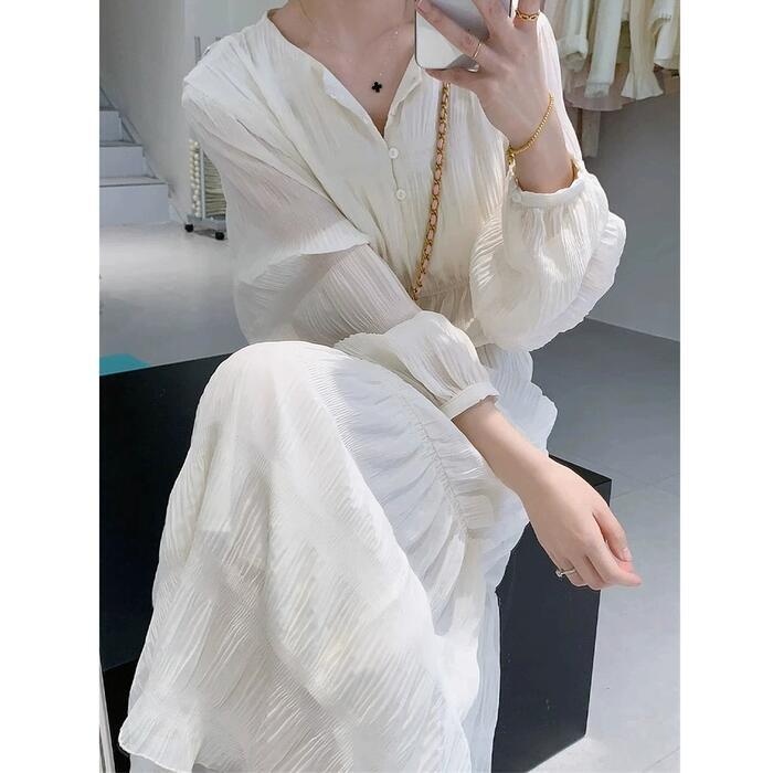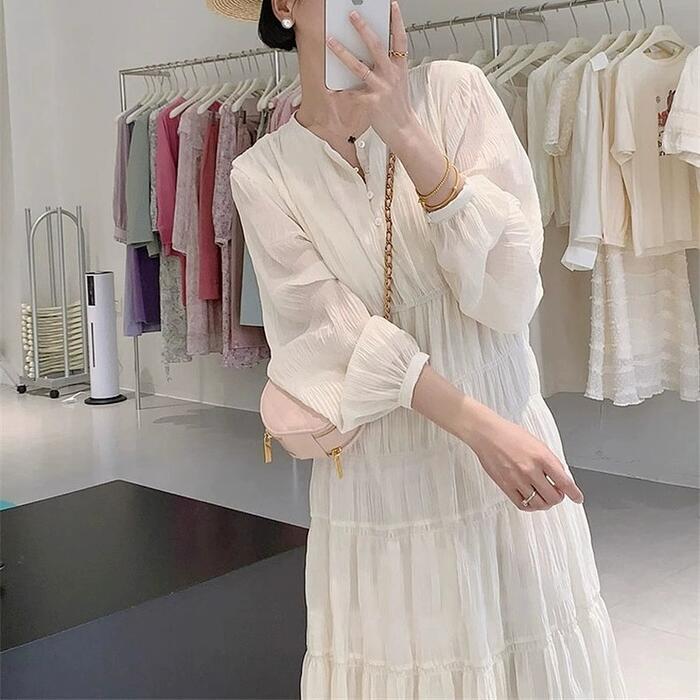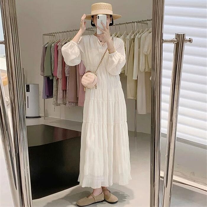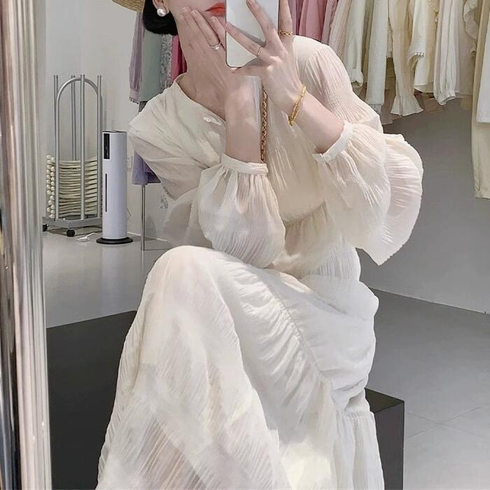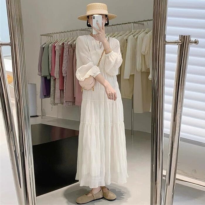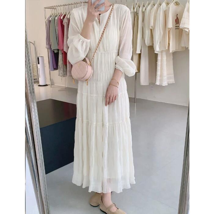 大きいサイズ ティアード ワンピース シワ プリーツ ドレス レディース きれいめ カジュアル ロング丈 透け感 シアー 長袖 大人 可愛い フェミニン ゆったり 楽ちん リラックス 体型カバー シンプル ナチュラル 韓国 ホワイト 白 春 夏 秋 20代 30代 40代 50代
