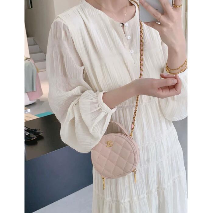 ワントーンのワンピースも凹凸感のあるプリーツ生地なら一枚で表情豊かに。