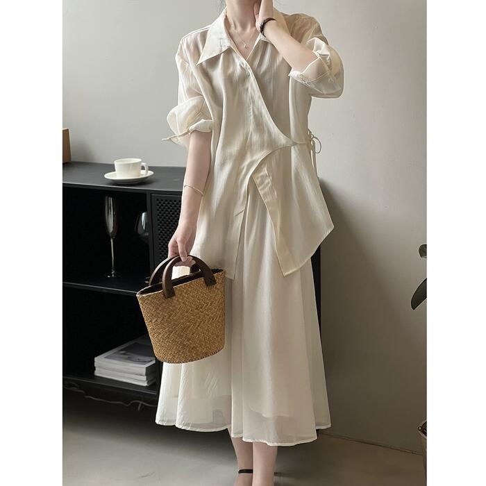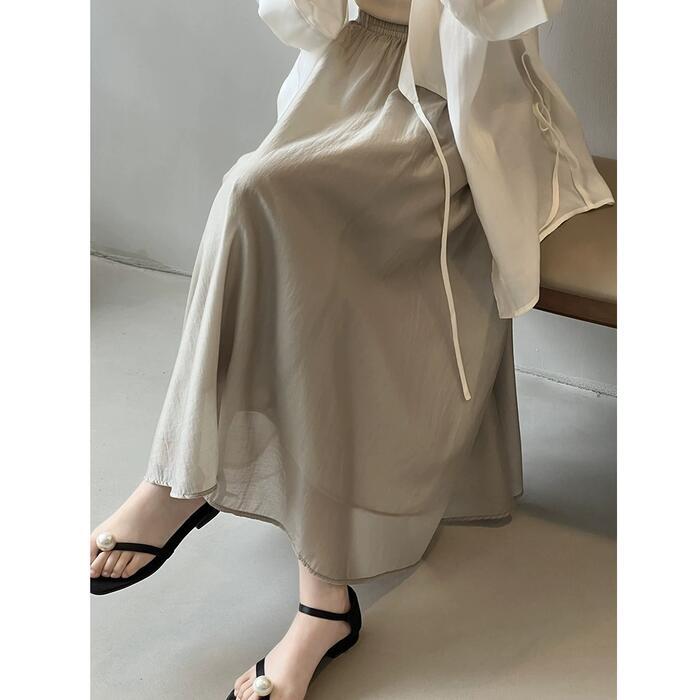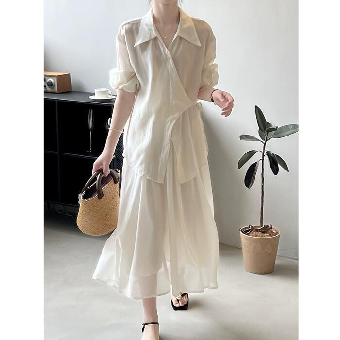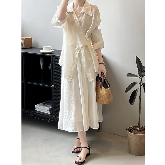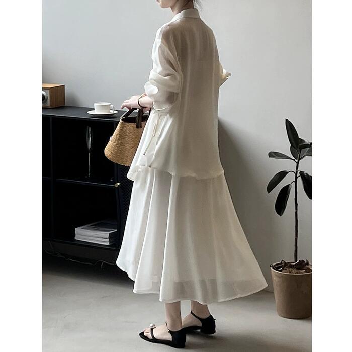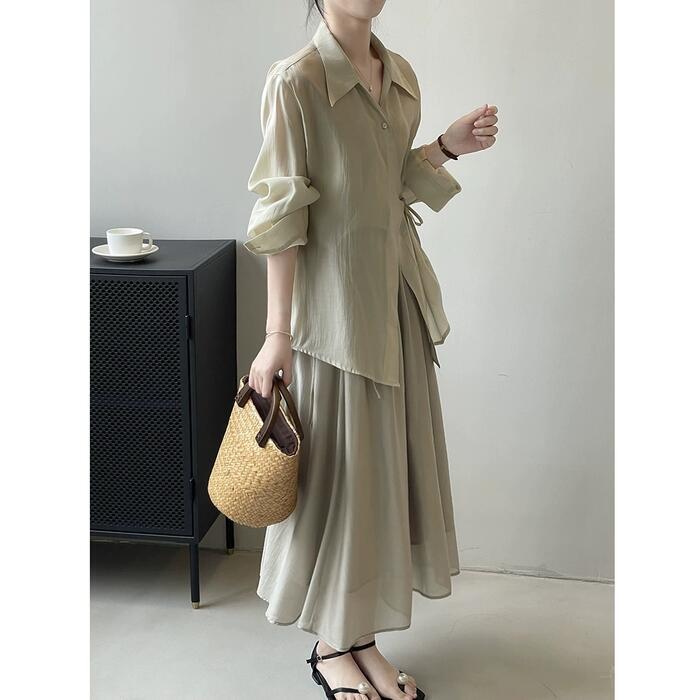 全2色 ゆったり シンプル セットアップ 2点セット トップス スカート カシュクール ブラウス 羽織り ミモレ丈 レディース エレガント きれいめ カジュアル 長袖 ミモレ丈 大人 可愛い フェミニン 体型カバー 韓国 ホワイト 白 グリーン 緑 春 夏 秋 20代 30代 40代 50代