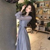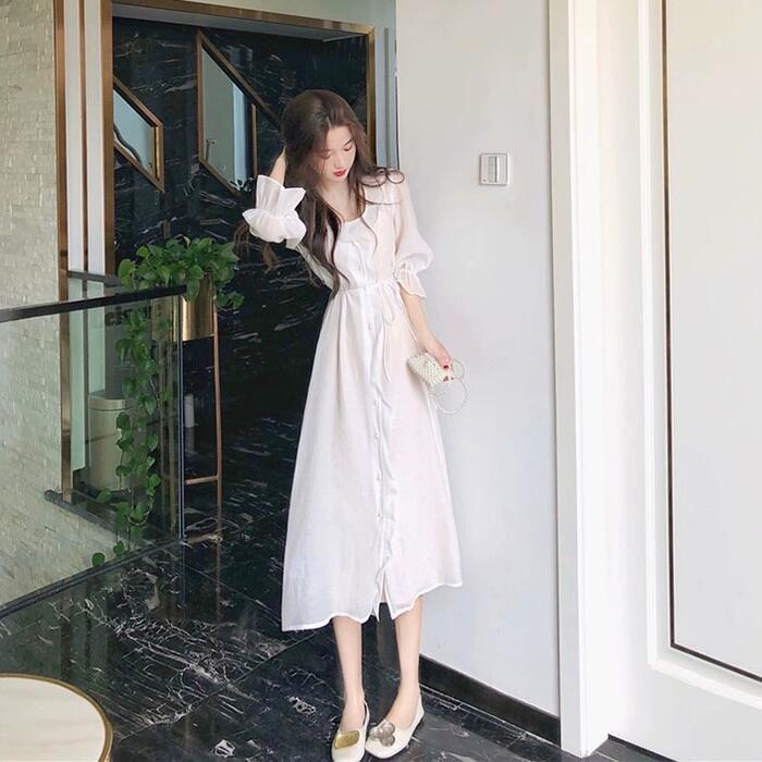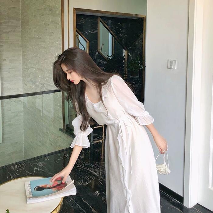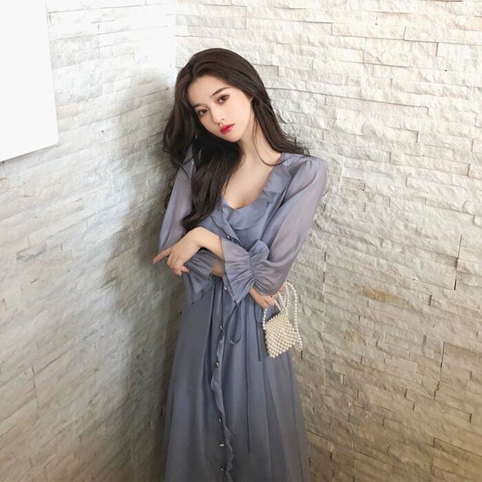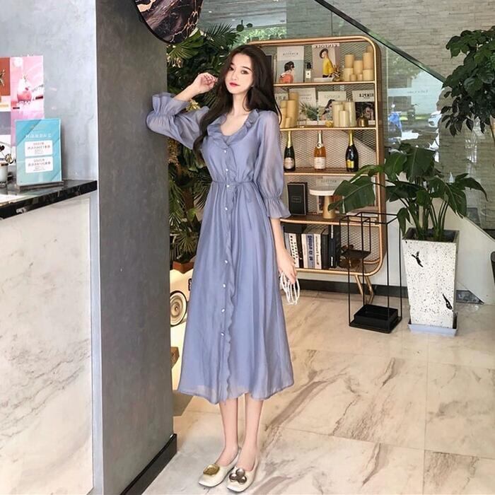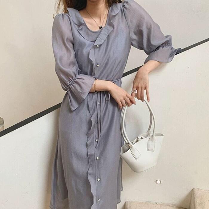 全2色 大きいサイズ ワンピース ラッフル フリル フレア ドレス レディース 袖あり エレガント きれいめ カジュアル ミモレ丈 長袖 大人 可愛い フェミニン Aライン 体型カバー シンプル 透け感 ナチュラル Vネック 韓国 グレー ホワイト 白 春 夏 秋 20代 30代 40代 50代