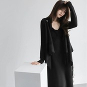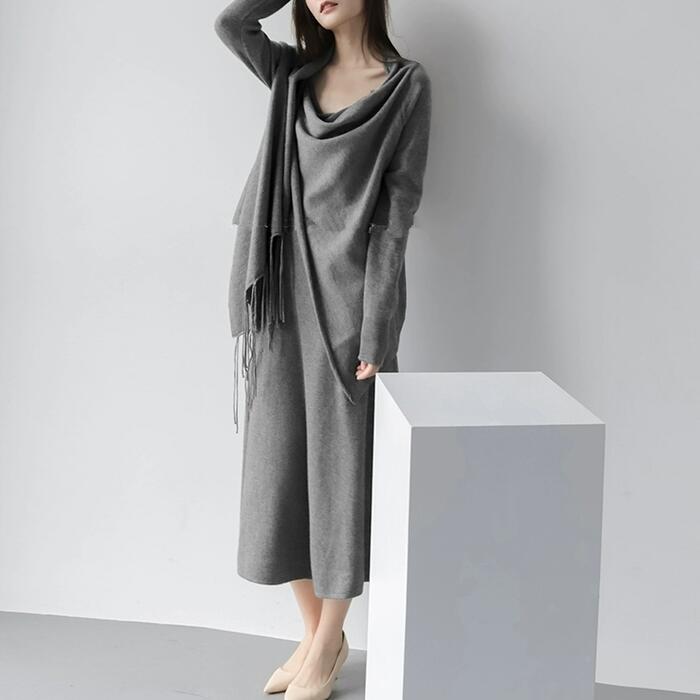 アシンメトリーなフリンジデザインがポイントになったショールカーディガン。