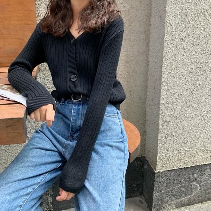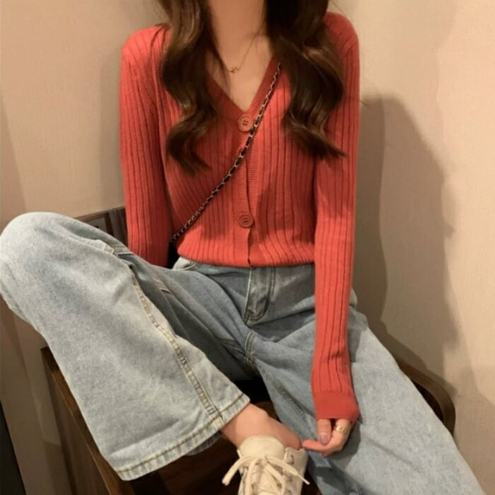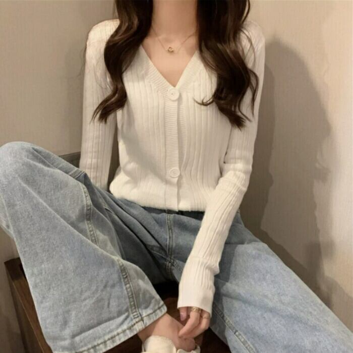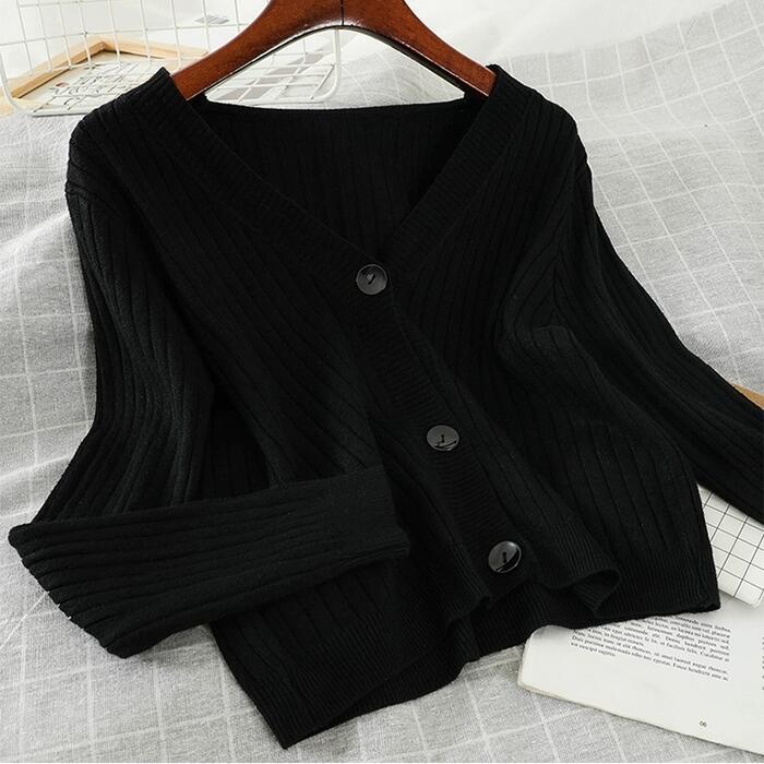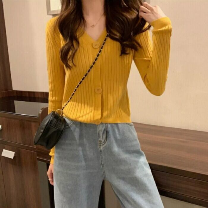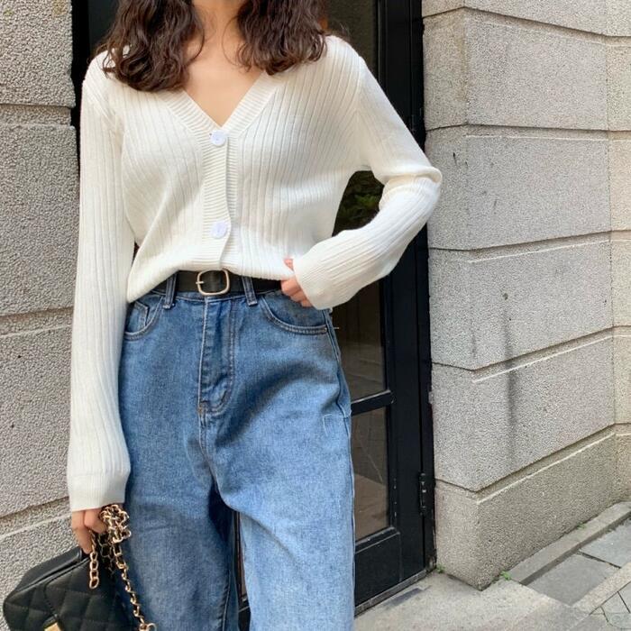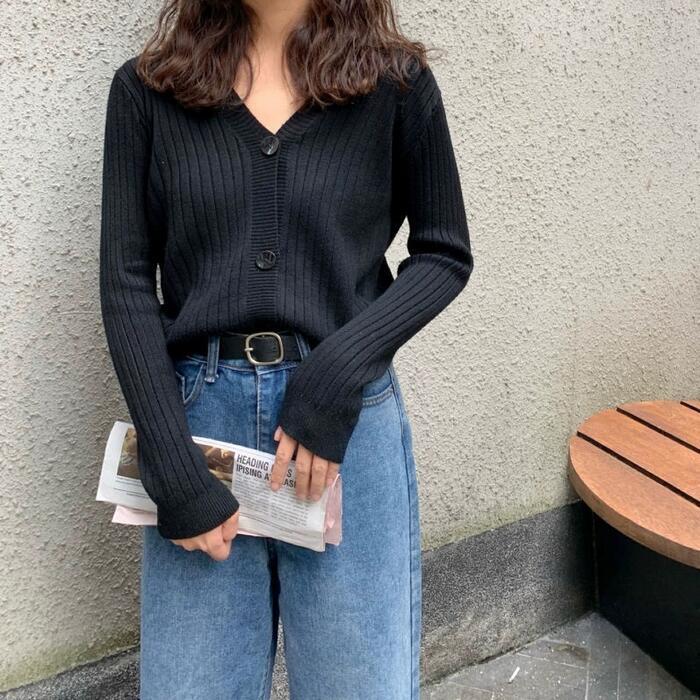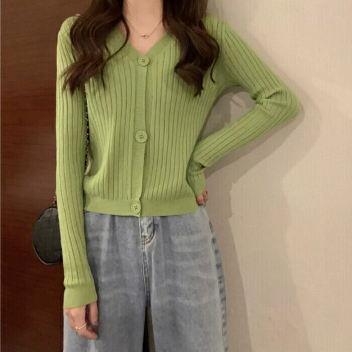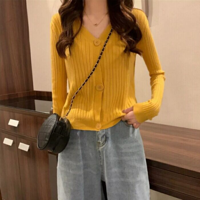 全5色 シンプル Vネック トップス カーディガン カットソー リブ ニット プルオーバー レディース エレガント きれいめ カジュアル 長袖 ショート丈 大人 可愛い フェミニン 体型カバー イエロー レッド 赤 グリーン 緑 ブラック 黒 ホワイト 白 春 秋 冬 20代 30代 40代 50代