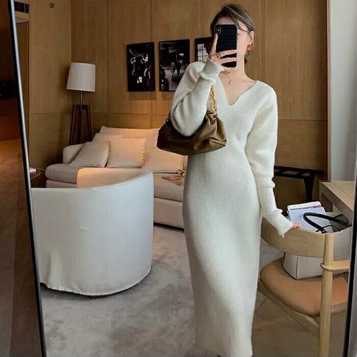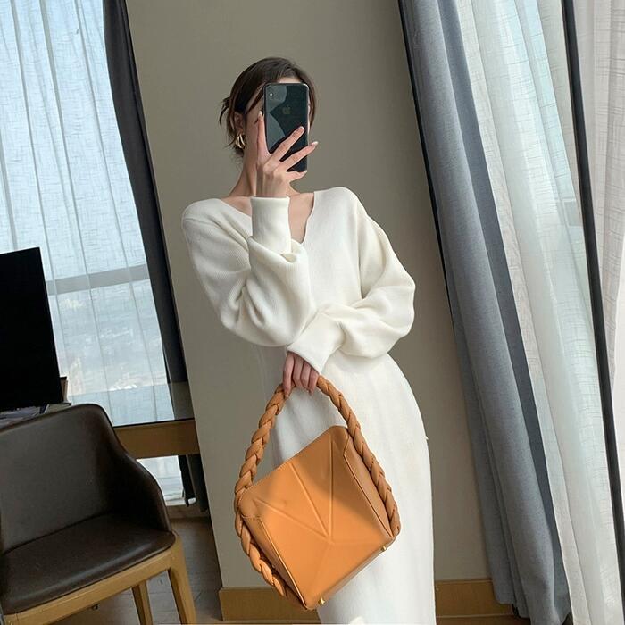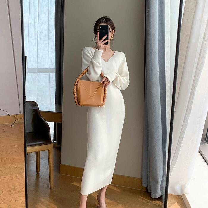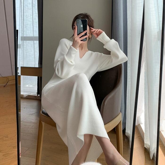 ワンピース ニット ドレス レディース 袖あり エレガント きれいめ カジュアル ミモレ丈 長袖 大人 可愛い フェミニン Vネック シンプル スリム ハイウエスト 大きいサイズ ホワイト 白 春 秋 冬 20代 30代 40代 50代