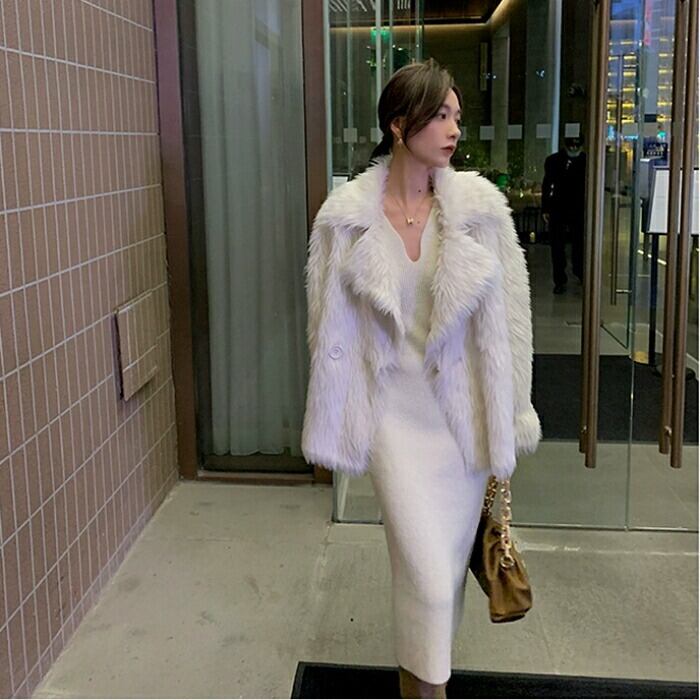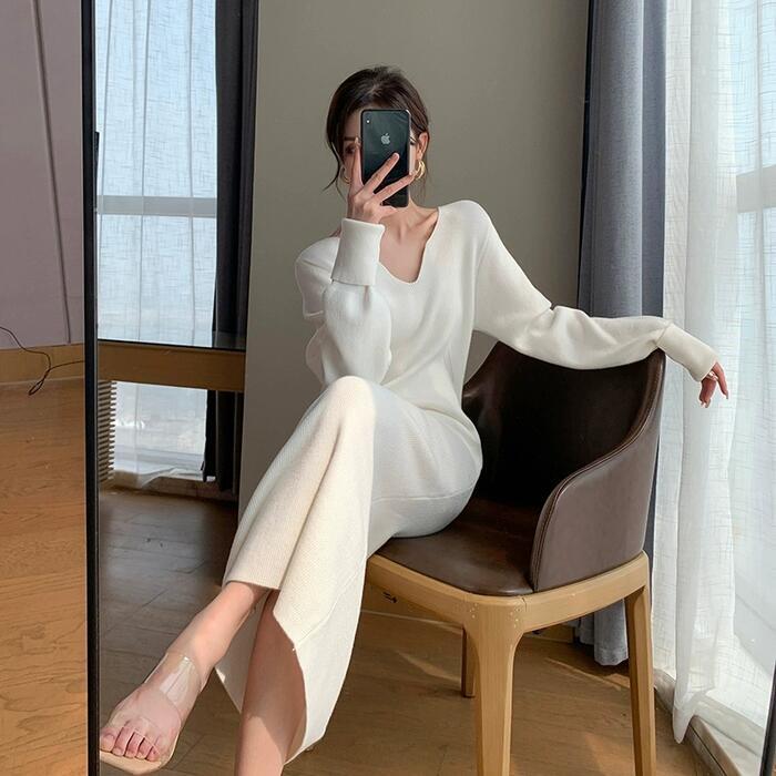 デコルテを綺麗に見せてくれるVネックのニットワンピース。