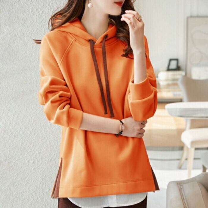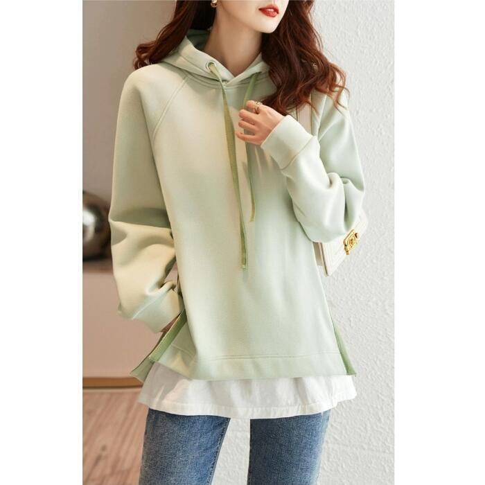 全5色 大きいサイズ トップス スウェット フーディー パーカー プルオーバー レディース きれいめ カジュアル 長袖 大人 可愛い フェミニン シンプル スリット レイヤード 体型カバー オレンジ ベージュ ブルー 青 グリーン 緑 グレー 春 秋 冬 20代 30代 40代 50代
