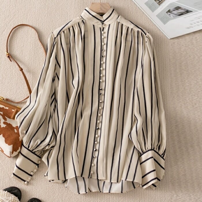 大きいサイズ パフスリーブ トップス ブラウス シャツ ストライプ レディース エレガント きれいめ カジュアル 長袖 大人 可愛い フェミニン ゆったり オーバーサイズ 透け感 シアー スタンドカラー 通勤 オフィス ベージュ 春 秋 夏 20代 30代 40代 50代