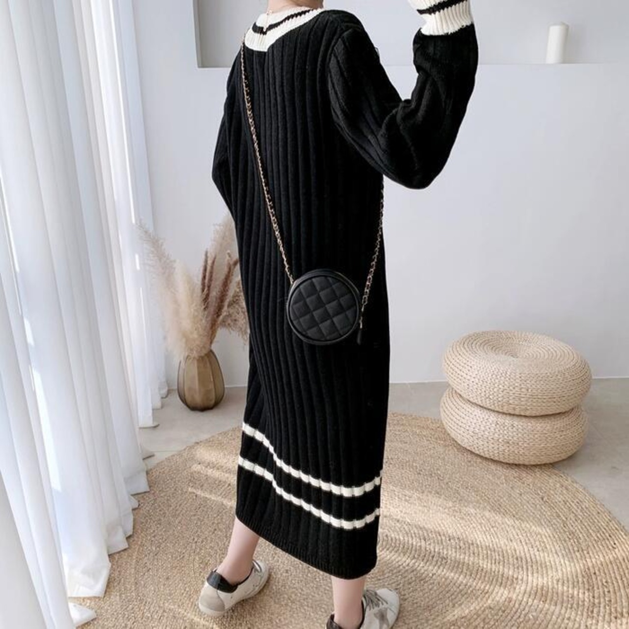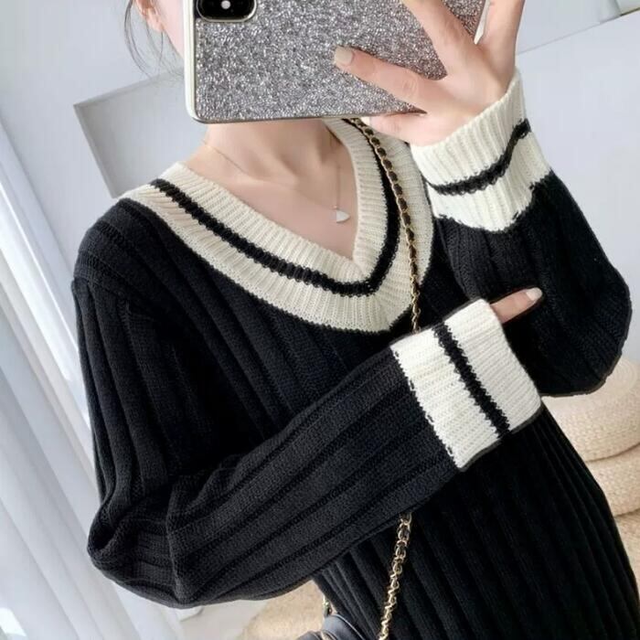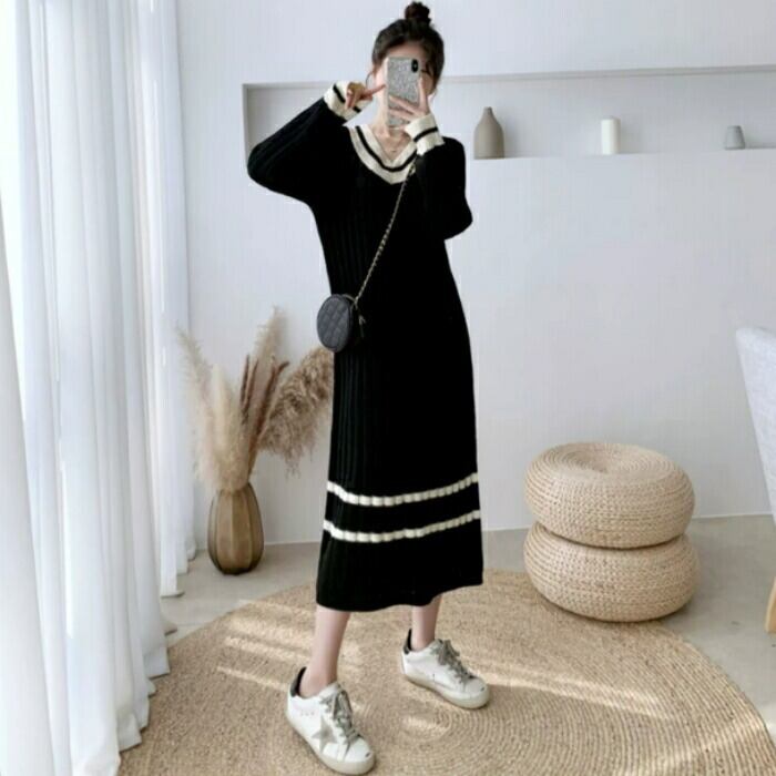 配色ラインデザインがアクセントになったリブニットワンピース。
