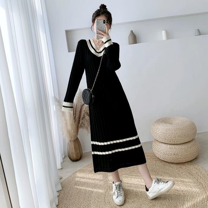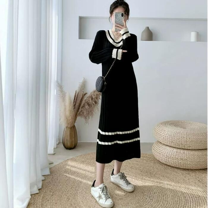 大きいサイズ ワンピース リブ ニット ドレス レディース 袖あり ライン エレガント きれいめ カジュアル ミモレ丈 長袖 大人 可愛い フェミニン クルーネック 配色 シンプル ゆったり 体型カバー Aライン 韓国 ブラック 黒 春 秋 冬 20代 30代 40代 50代