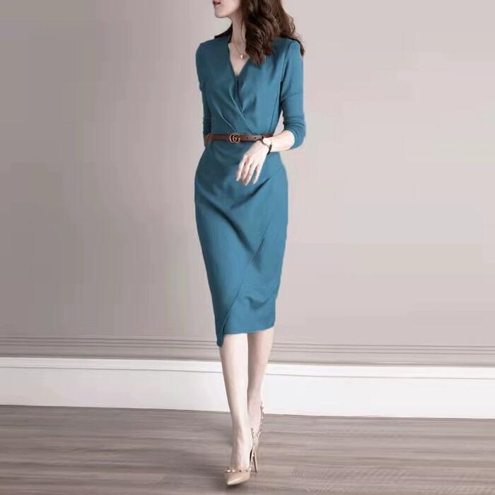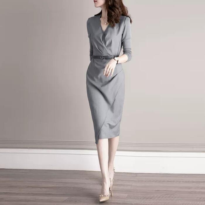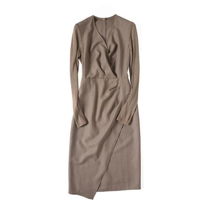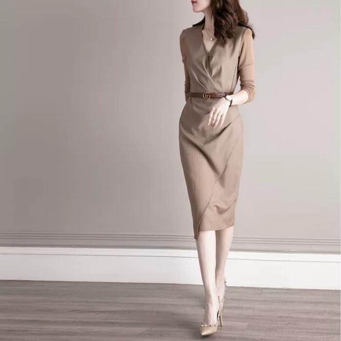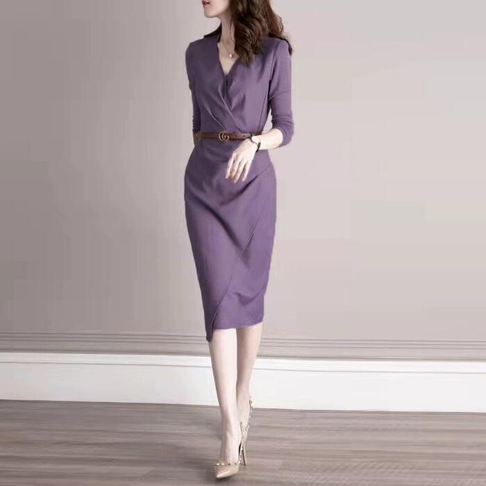 全5色 大きいサイズ ワンピース ドレス レディース 袖あり カシュクール タイト Vネック エレガント きれいめ カジュアル ミモレ丈 長袖 大人 可愛い フェミニン シンプル お呼ばれ オフィス 通勤 パープル ベージュ グレー ブラック 黒 春 秋 冬 20代 30代 40代 50代