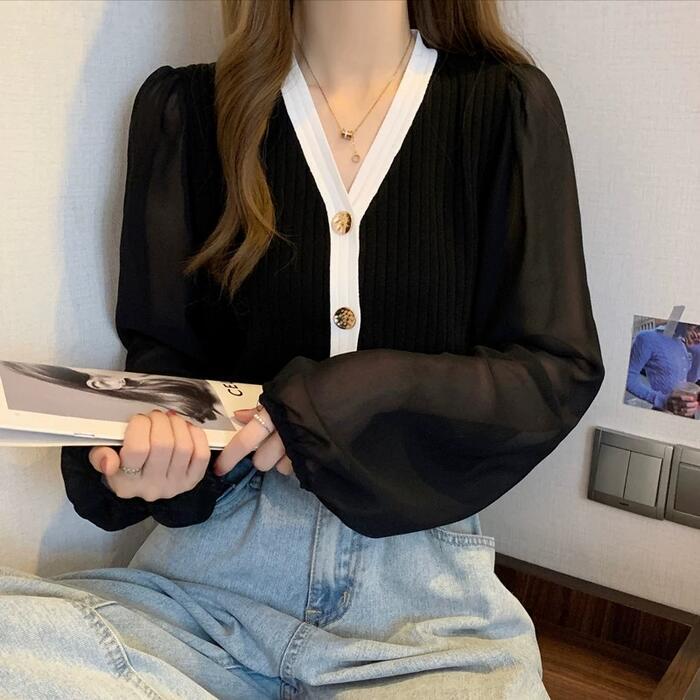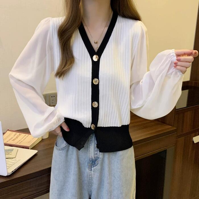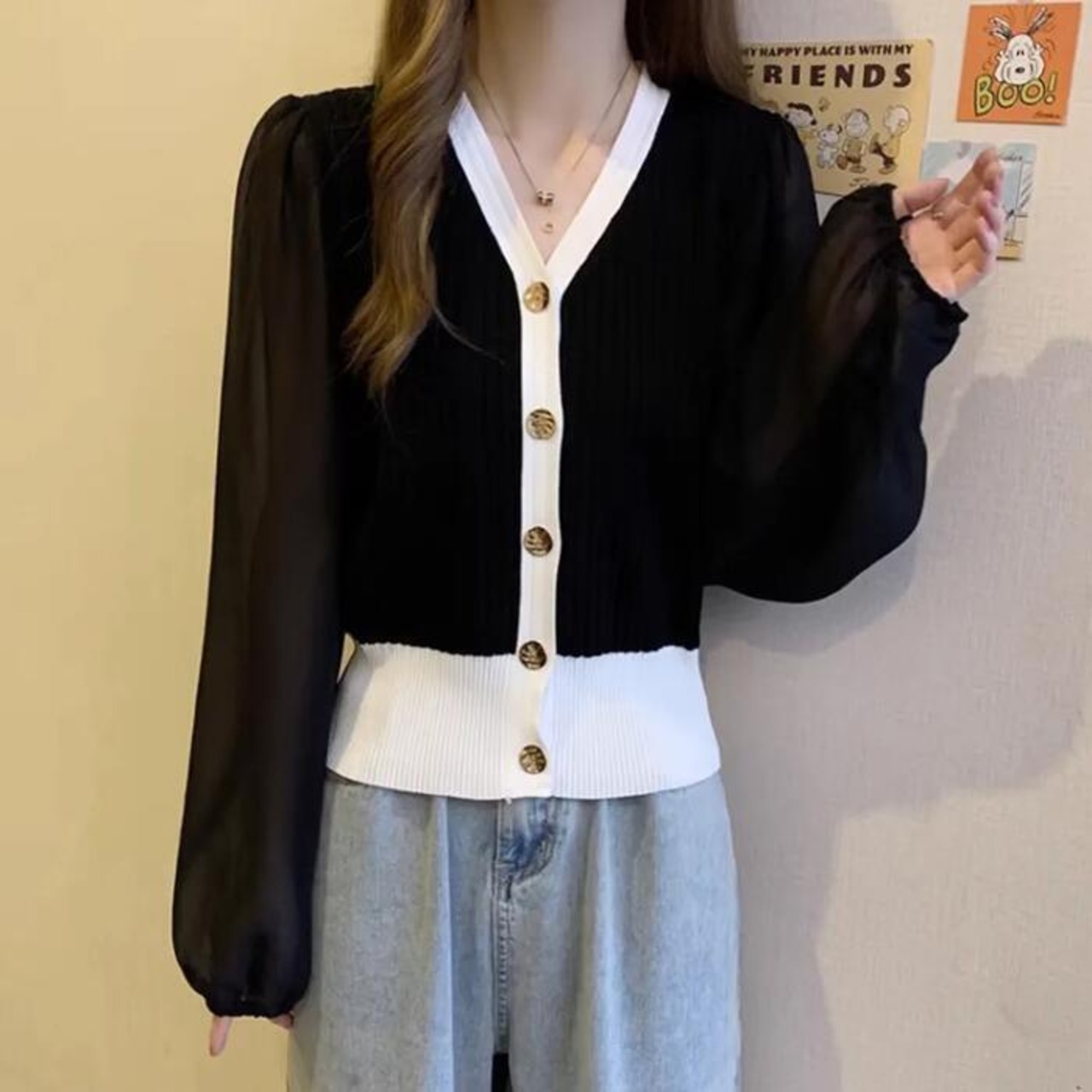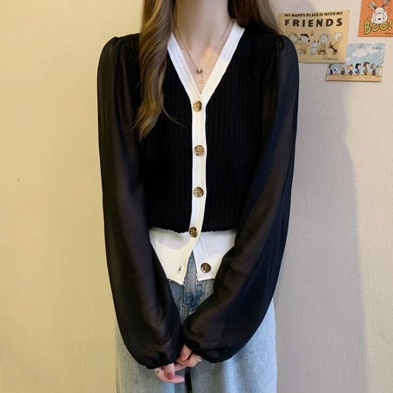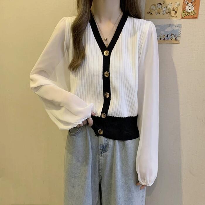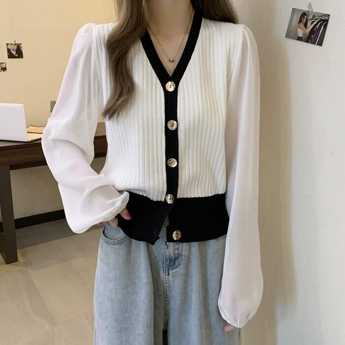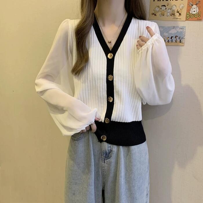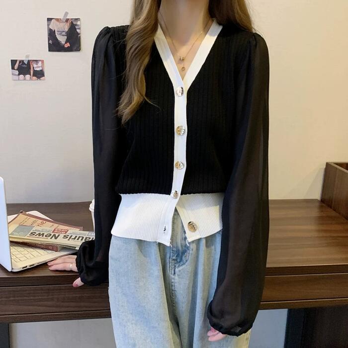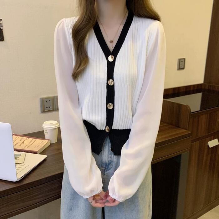 袖を透け感のあるシフォンに切り替えた配色カーディガン。