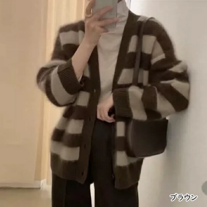 全3色 大きいサイズ トップス ニット シャギー カーディガン ボーダー ジャケット 羽織り カットソー レディース きれいめ カジュアル 長袖 ゆったり 大人 可愛い フェミニン 体型カバー ブラウン カーキ ベージュ 春 秋 冬 20代 30代 40代 50代