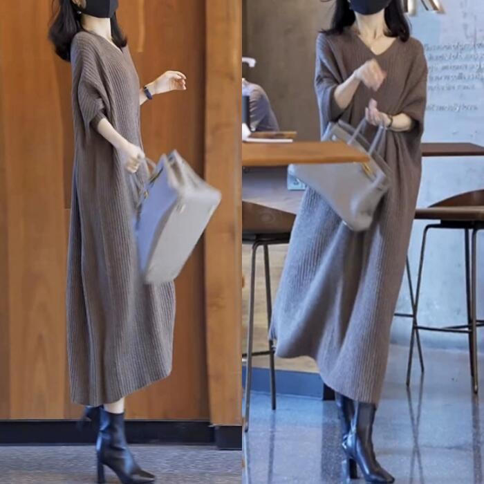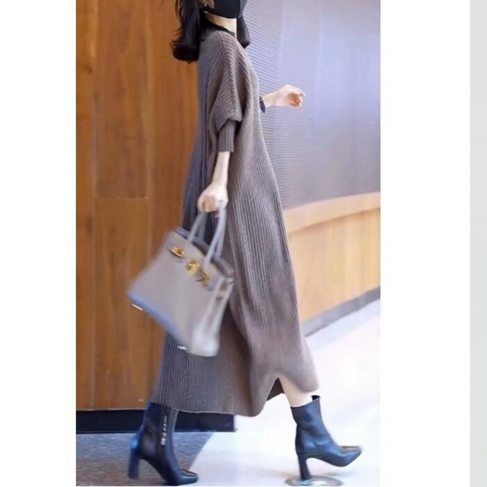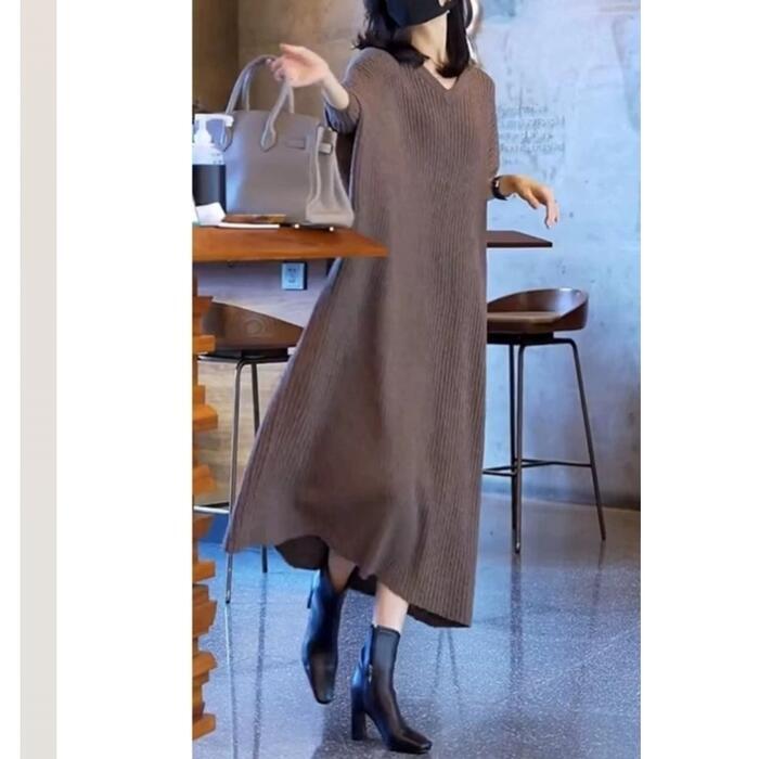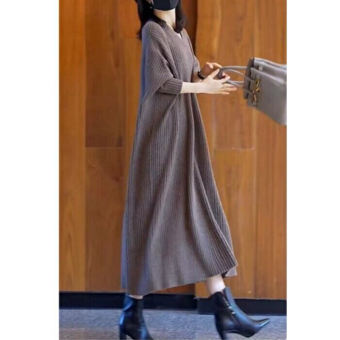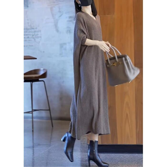 ニット リブ ワンピース レディース 袖あり エレガント きれいめ カジュアル ミモレ丈 長袖 大人 可愛い フェミニン シンプル Aライン ナチュラル ゆったり 体型カバー リラックス 韓国 大きいサイズ グレー 春 秋 冬 20代 30代 40代 50代