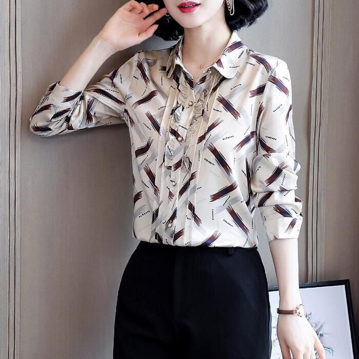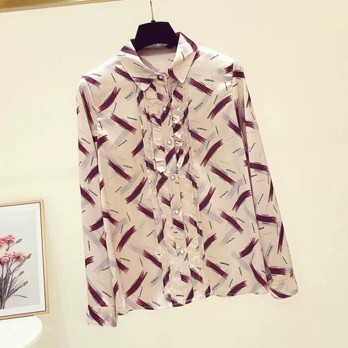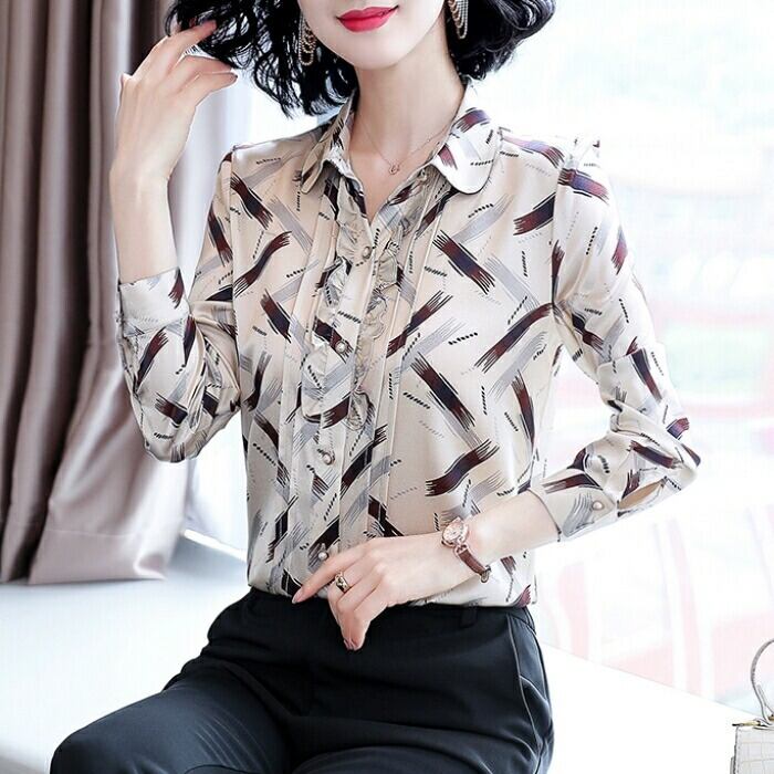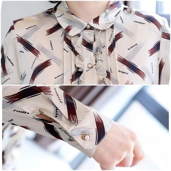 トップス ブラウス シャツ フリル プリント レディース エレガント きれいめ カジュアル 長袖 大人 可愛い フェミニン 幾何学 シック おしゃれ 上品 オフィス 通勤 ナチュラル パールボタン 大きいサイズ シフォン 春 秋 冬 20代 30代 40代 50代