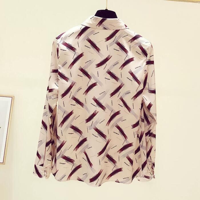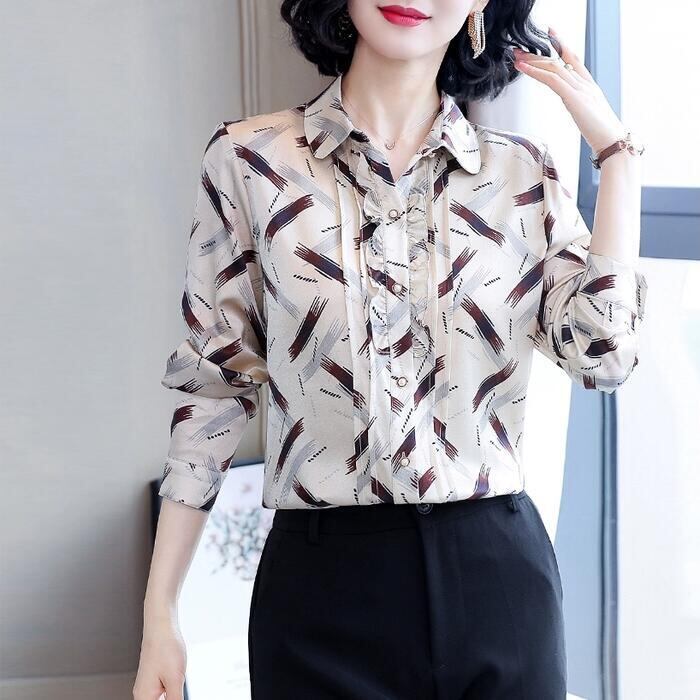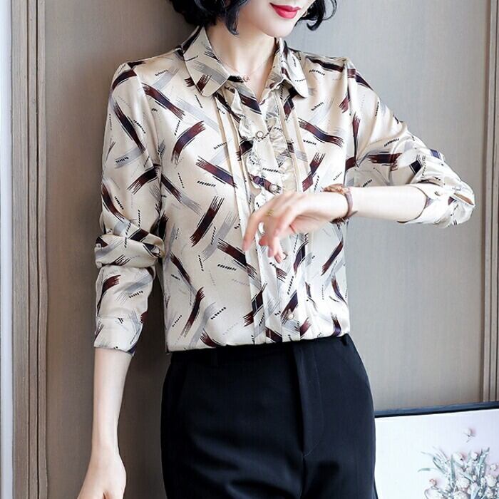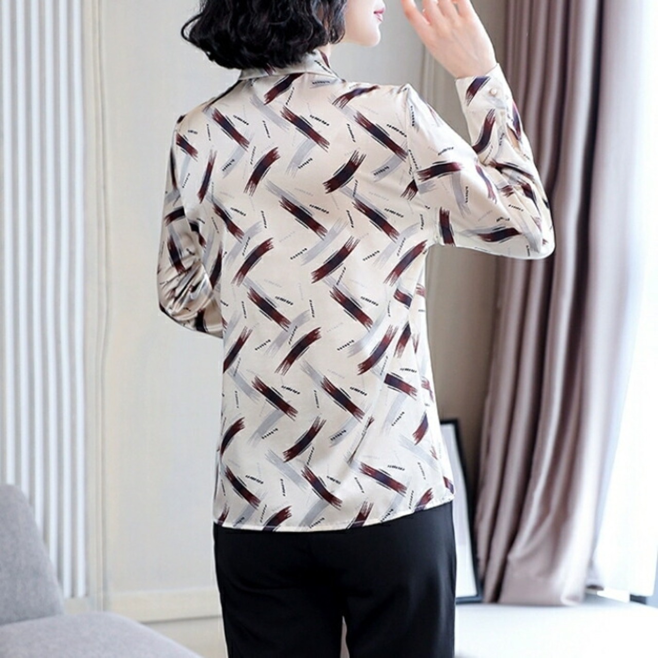 落ち着いたシックなプリント柄のシフォンブラウス。