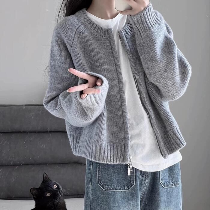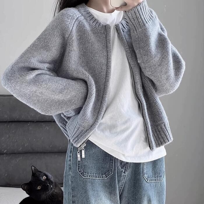 サッと羽織れるジップアップのニットカーディガン。