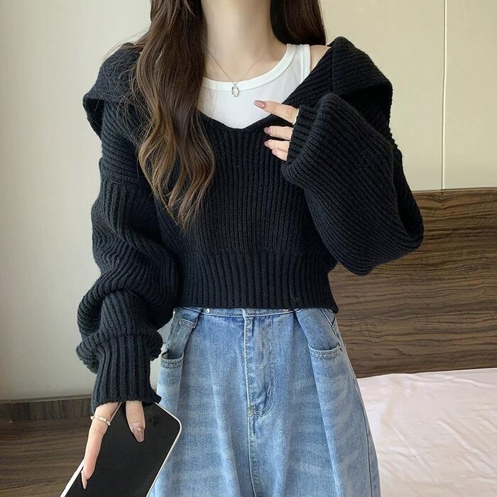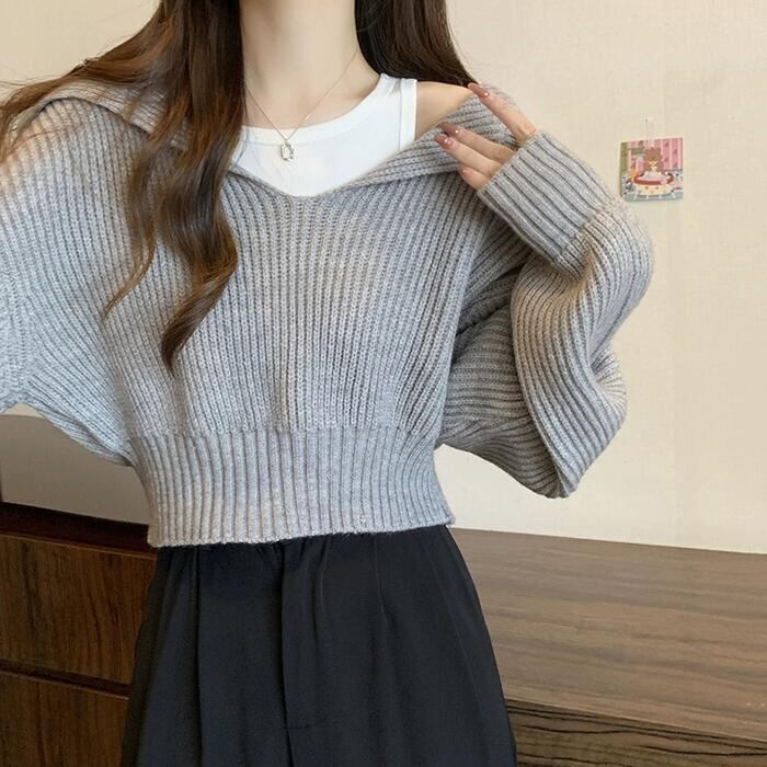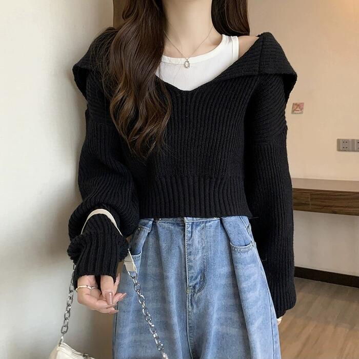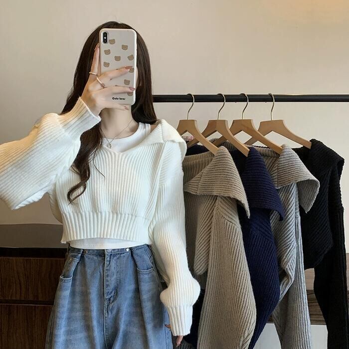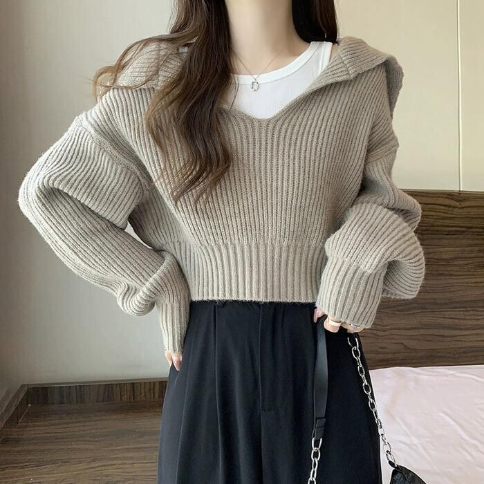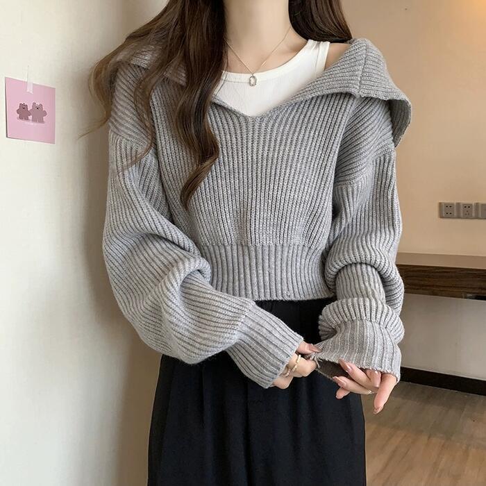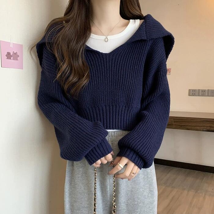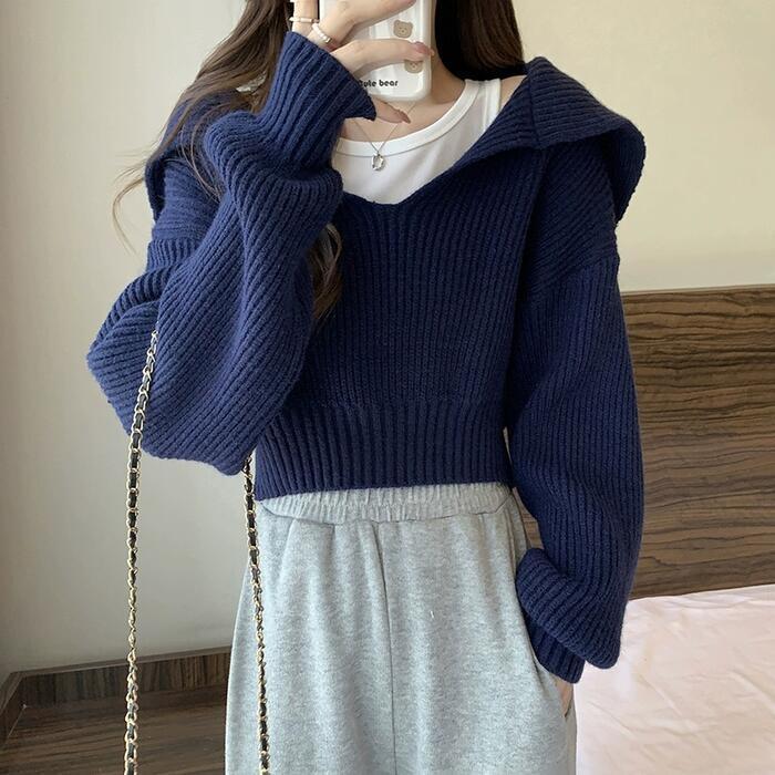 全5色 大きいサイズ おしゃれ 体型カバー フェミニン トップス ニット 襟付き セーター カットソー プルオーバー ショート丈 クロップド丈 レディース きれいめ カジュアル 長袖 大人 可愛い Vネック ビッグカラー 韓国 ブルー 青 ホワイト 白 ブラック 黒 グレー ベージュ 春 秋 冬 20代 30代 40代 50代