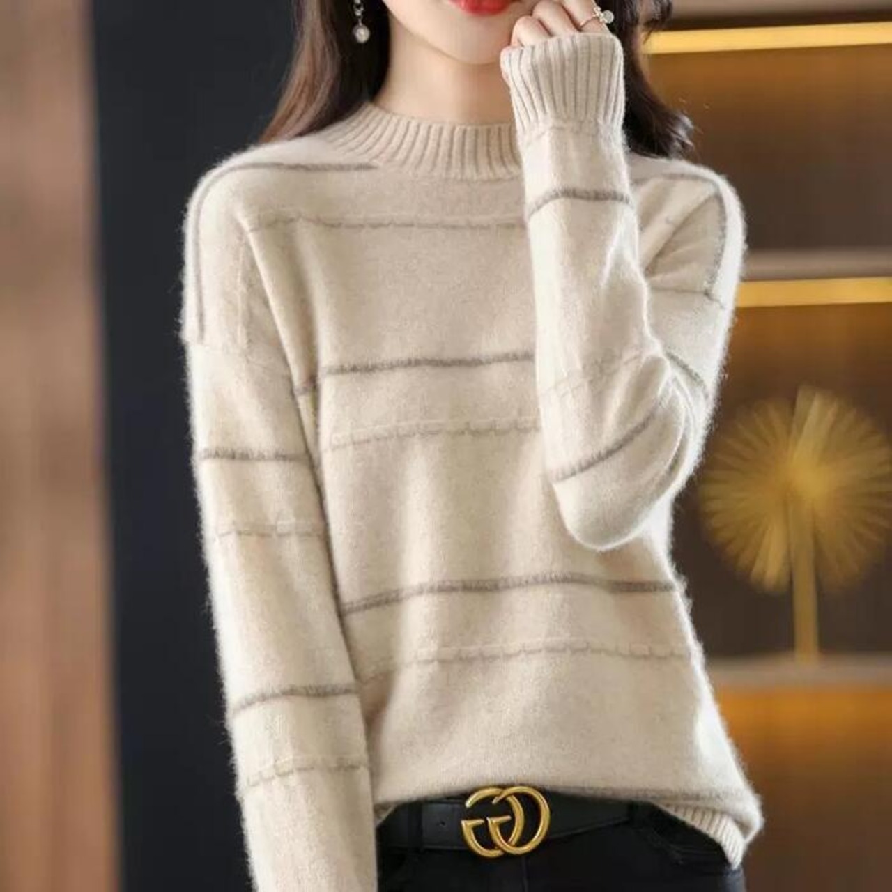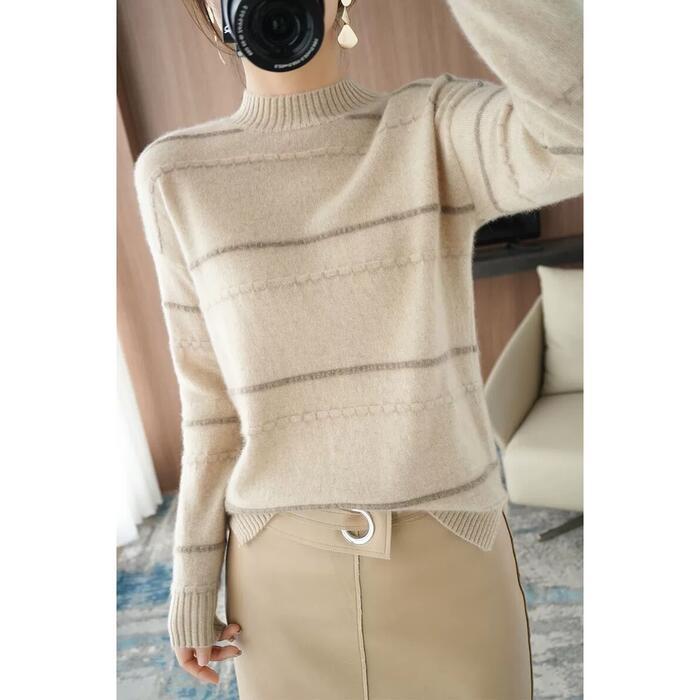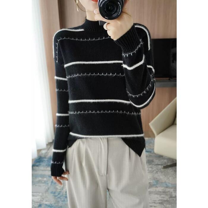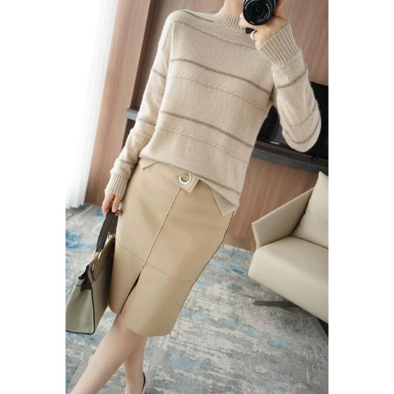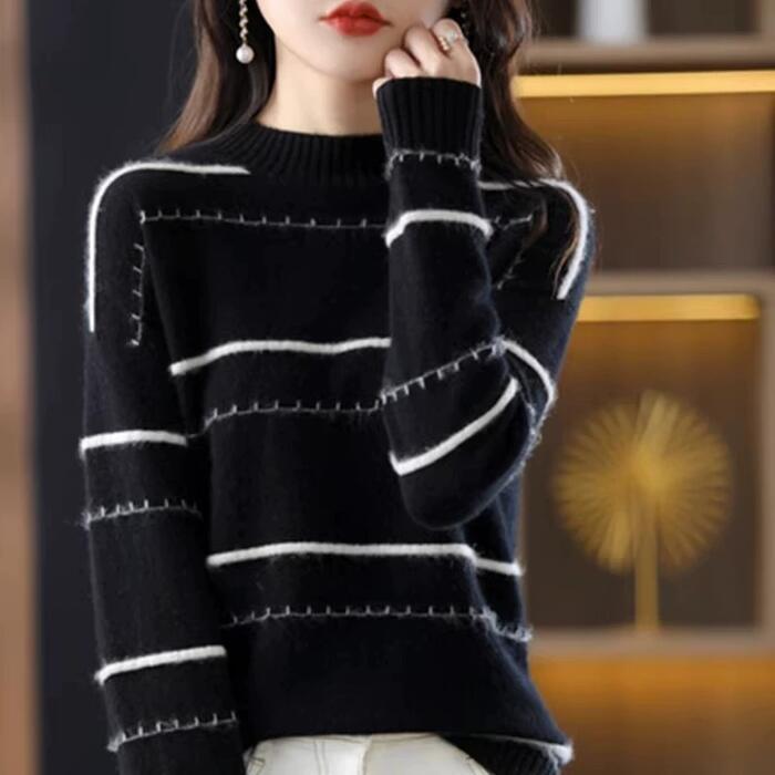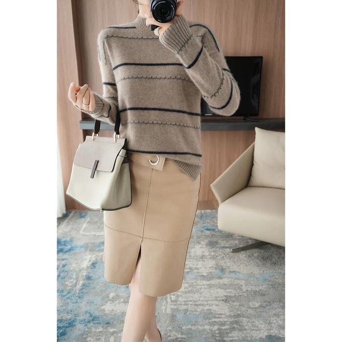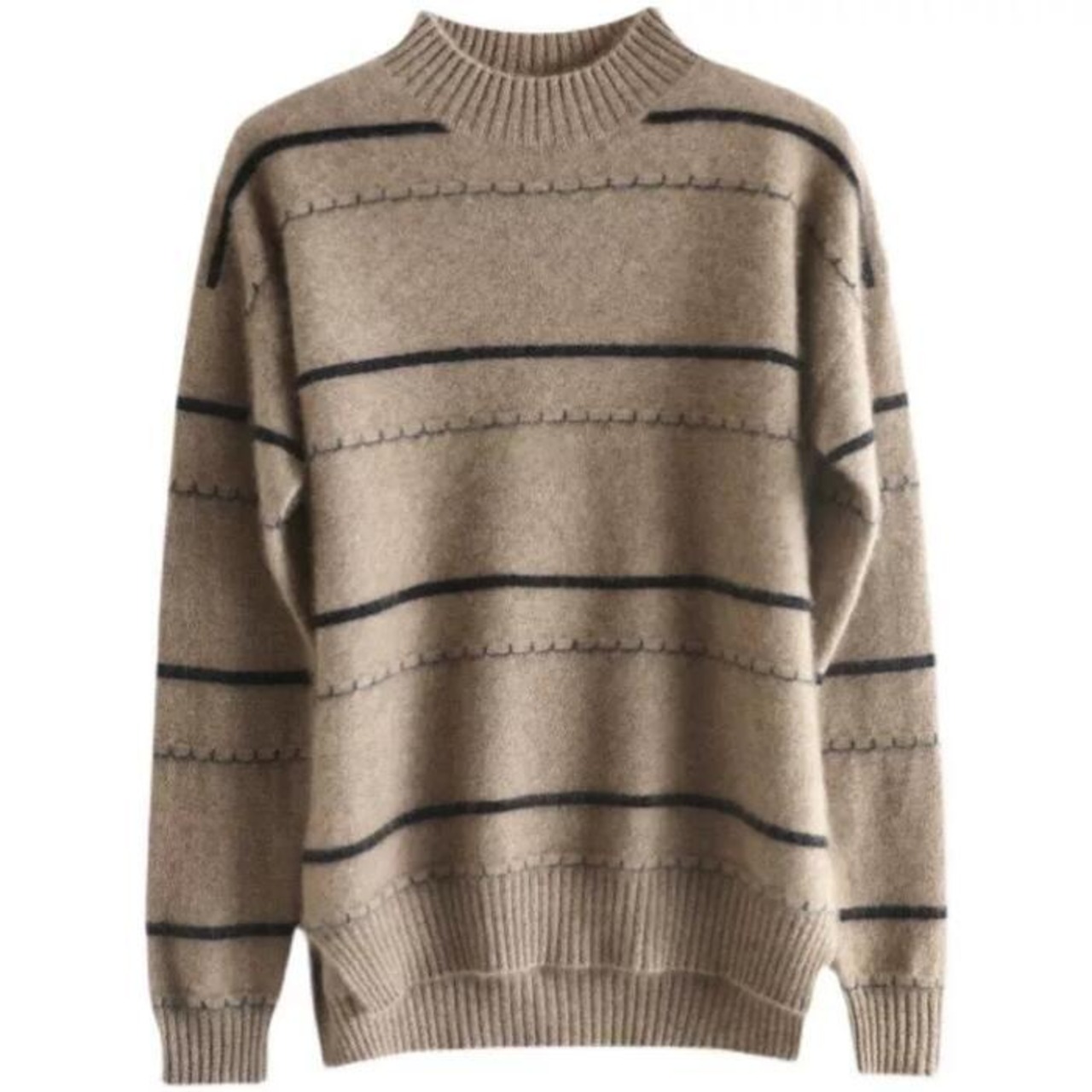全3色 大きいサイズ トップス ニット セーター カットソー プルオーバー ライン ボーダー レディース エレガント きれいめ カジュアル 長袖 大人 可愛い 上品 フェミニン おしゃれ ウール ベージュ ブラウン ブラック 黒 春 秋 冬 20代 30代 40代 50代