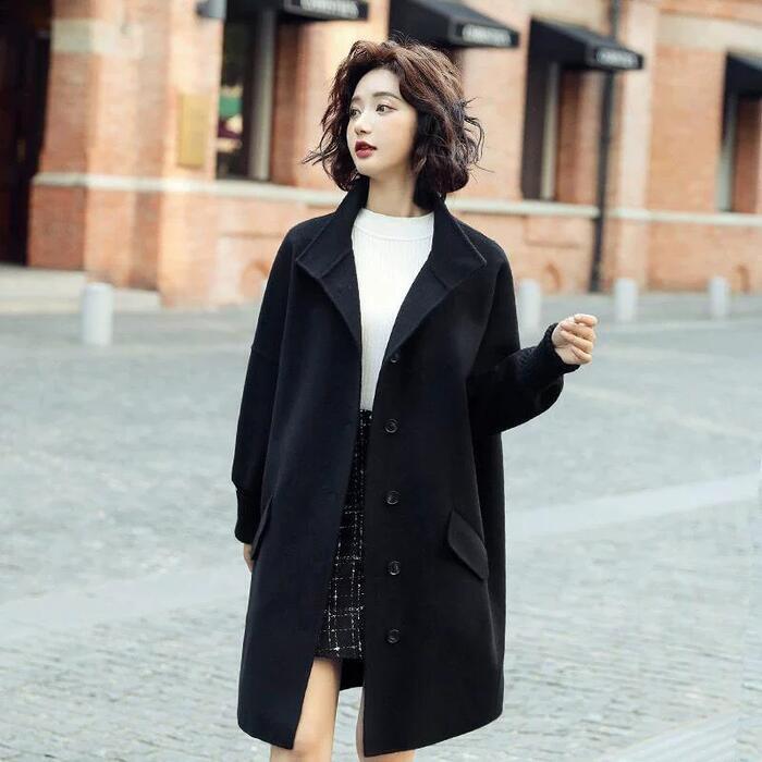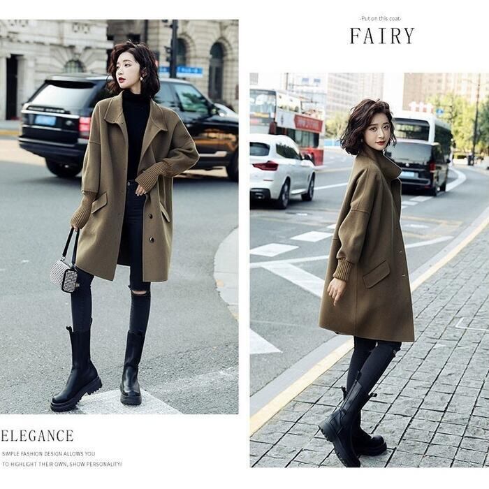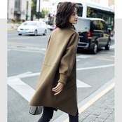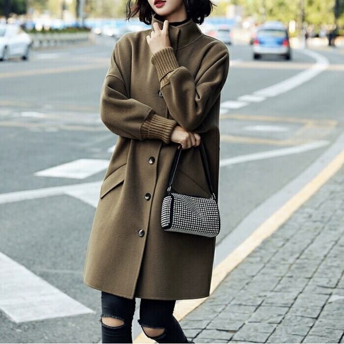 ハイネックデザインが洗練された雰囲気のミドル丈コート。