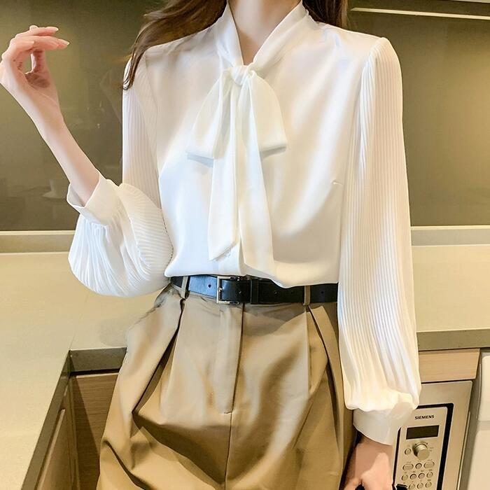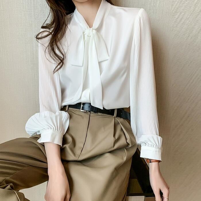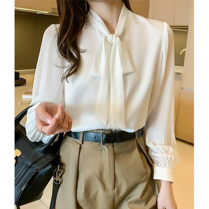 ボウタイ トップス ブラウス シャツ リボン プリーツ レディース エレガント きれいめ カジュアル 長袖 大人 可愛い フェミニン おしゃれ 上品 オフィス 通勤 ナチュラル 大きいサイズ シフォン ホワイト 白 春 秋 冬 20代 30代 40代 50代