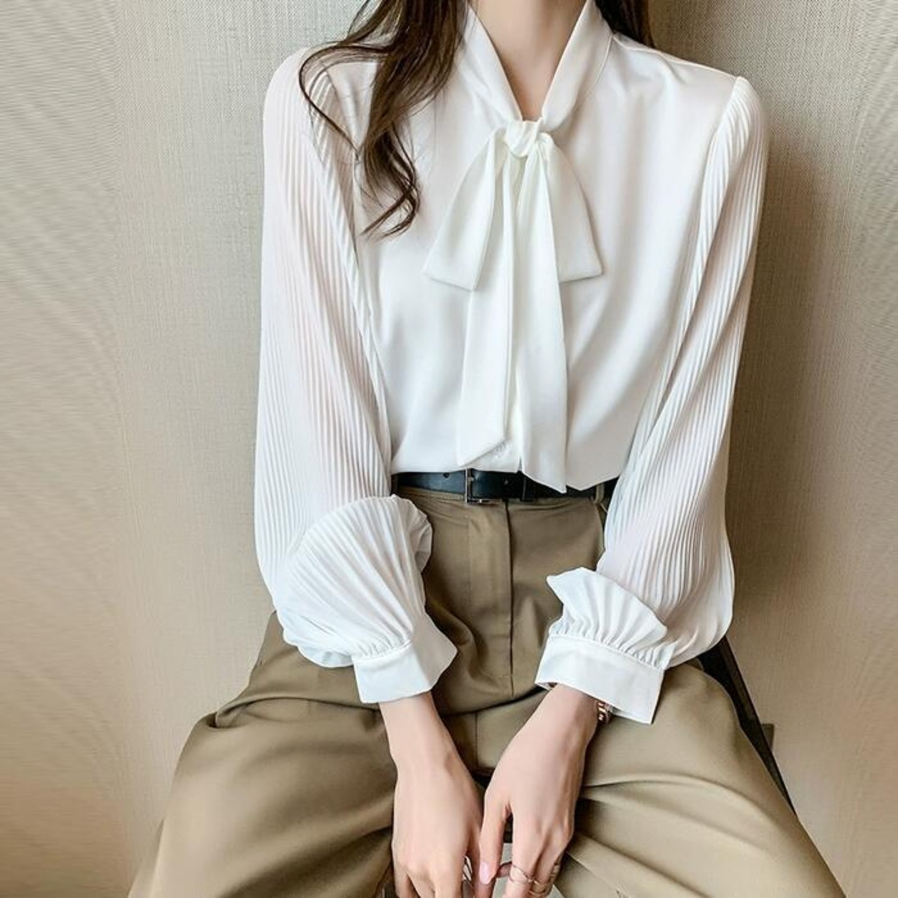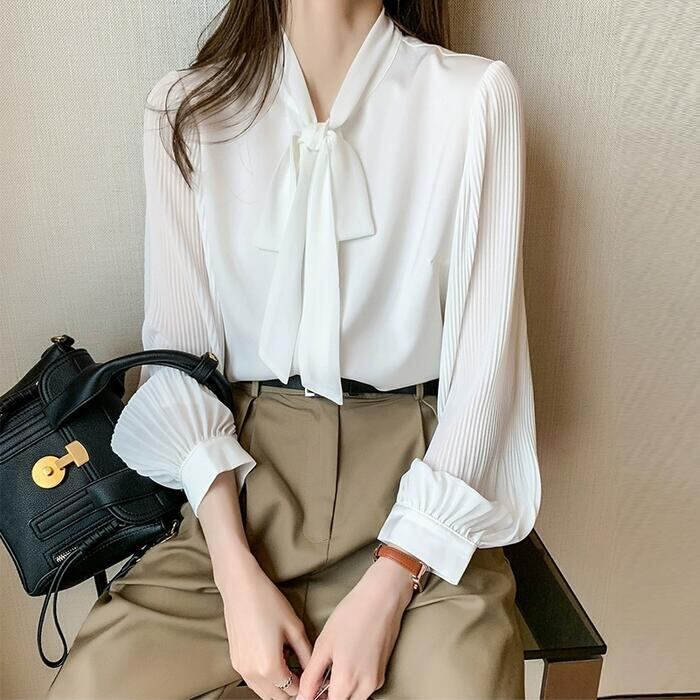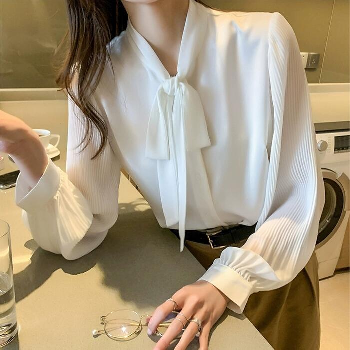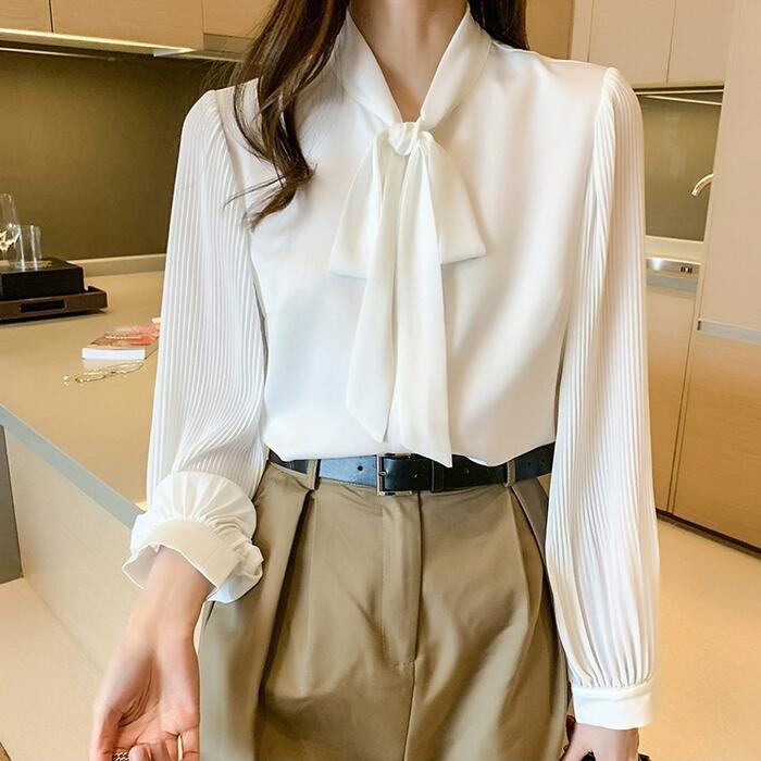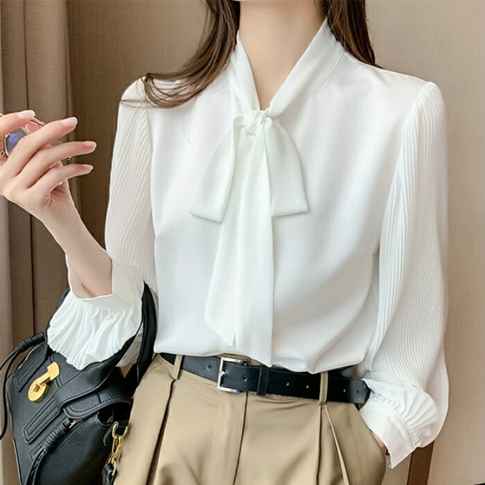 袖部分をプリーツに切り替えた、上品可愛いボウタイブラウス。