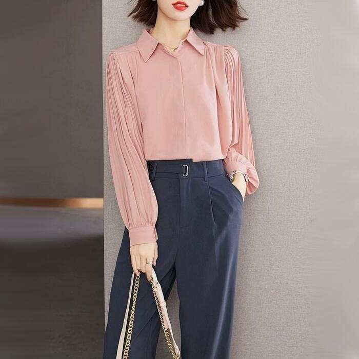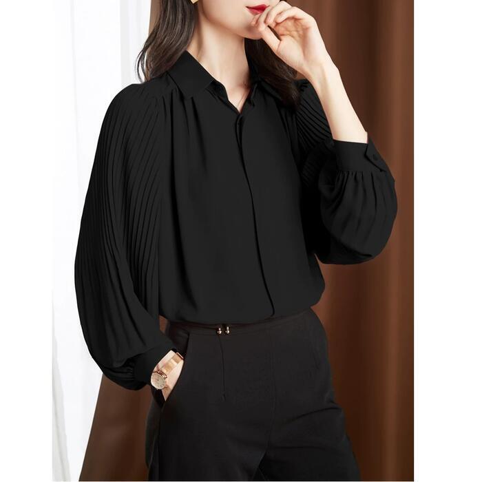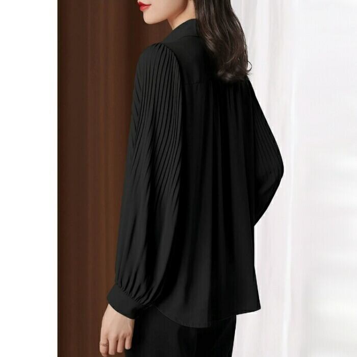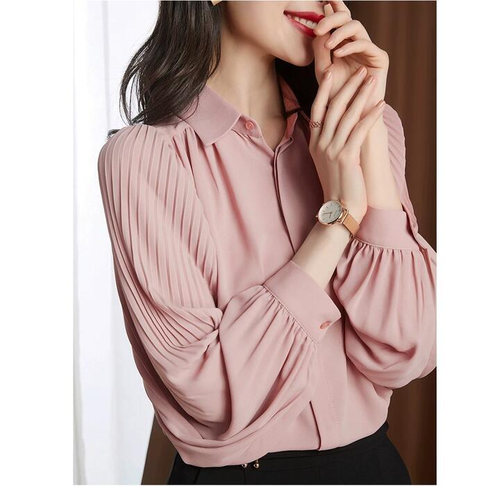 全2色 袖コンシャス トップス ブラウス シャツ プリーツ レディース エレガント きれいめ カジュアル 長袖 大人 可愛い フェミニン おしゃれ 上品 オフィス 通勤 ナチュラル 大きいサイズ シフォン ピンク ブラック 黒 春 秋 冬 20代 30代 40代 50代