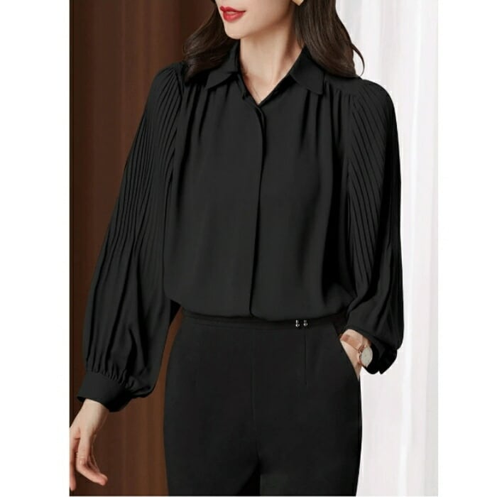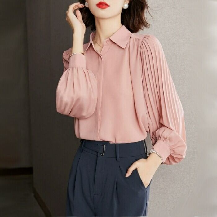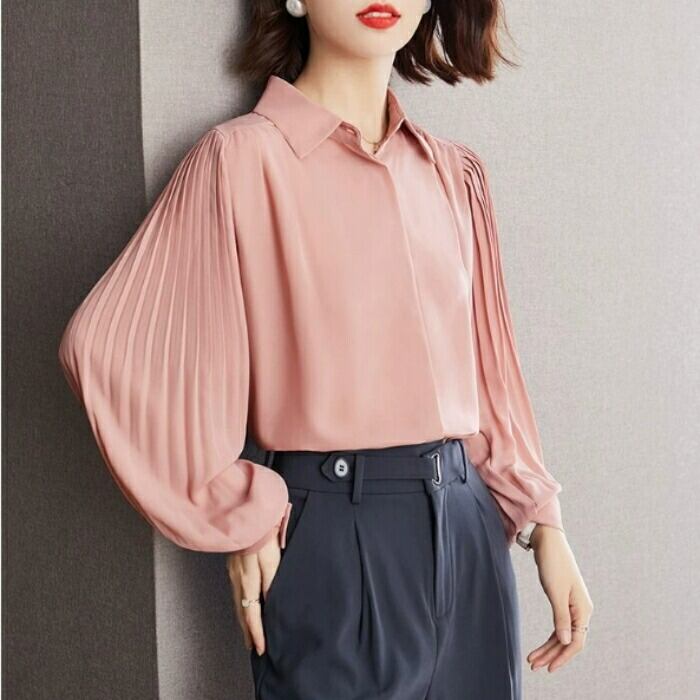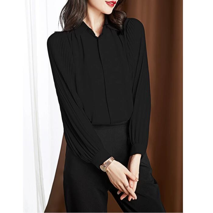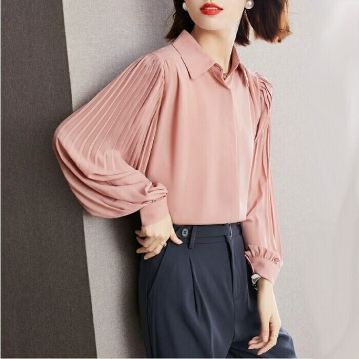 袖にプリーツ加工が施された、ラグジュアリーかつ上品な印象のブラウス。