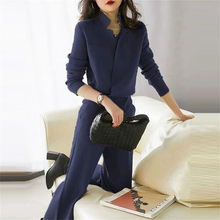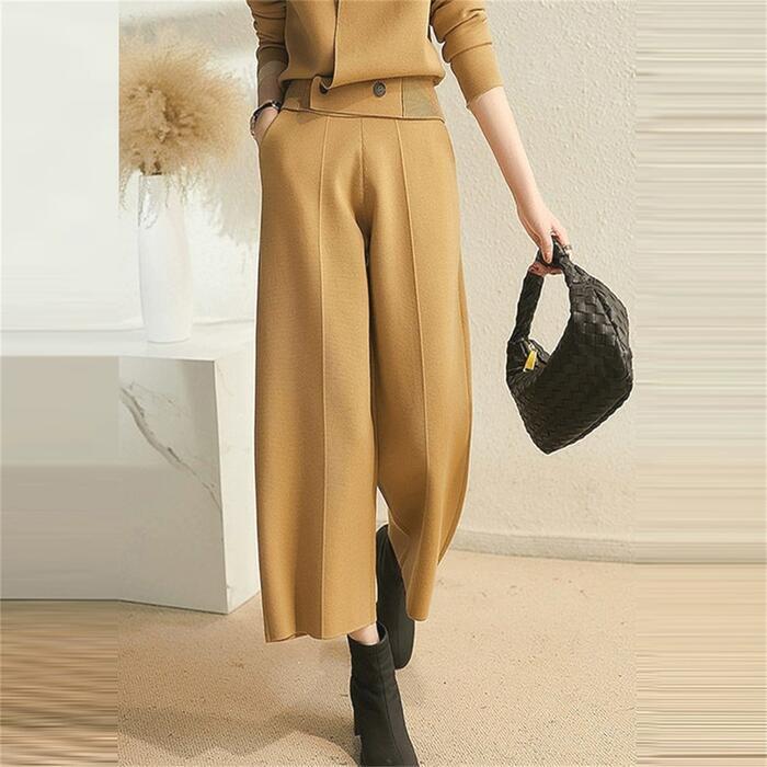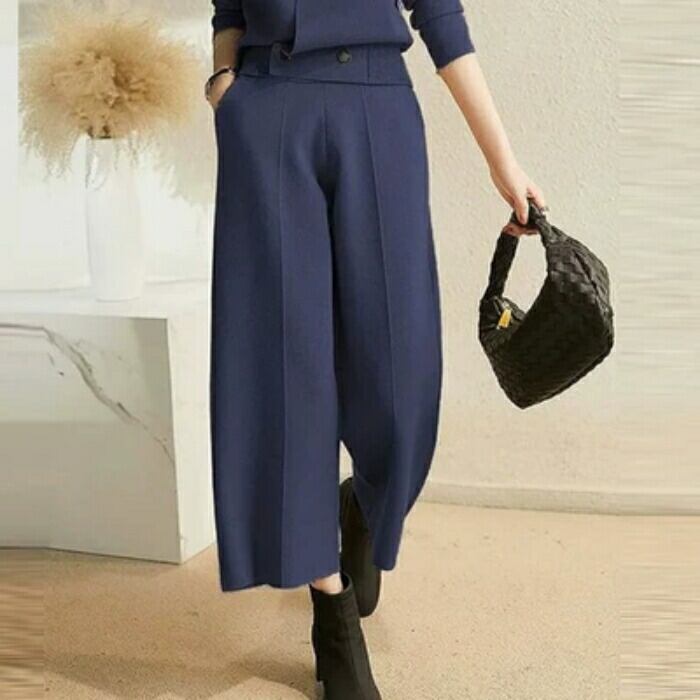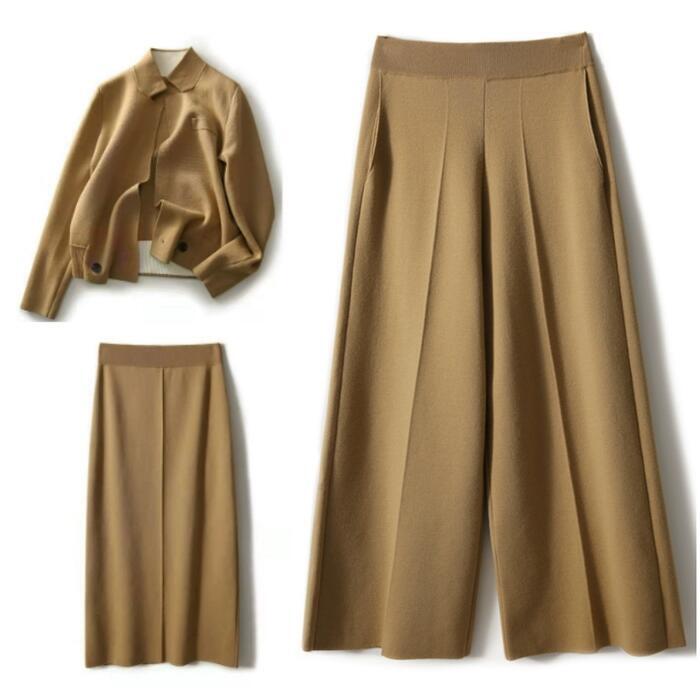 全2種2色 シンプル 体型カバー セット セットアップ 2点セット ニット トップス スカート パンツ ミモレ丈 ガウチョ クロップド丈 レディース エレガント きれいめ カジュアル 長袖 レイヤード 大人 可愛い フェミニン ベージュ ネイビー 春 冬 秋 20代 30代 40代 50代