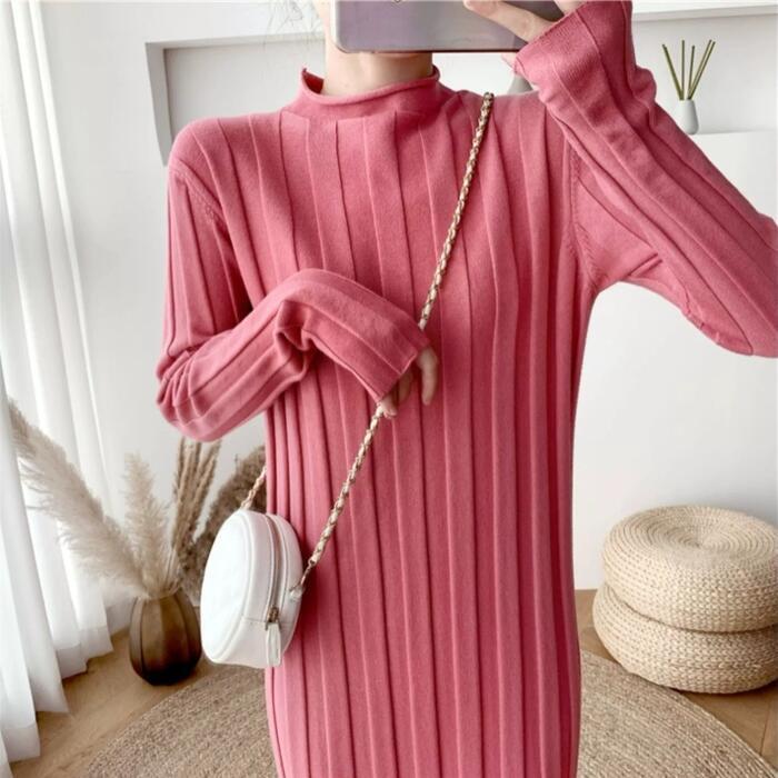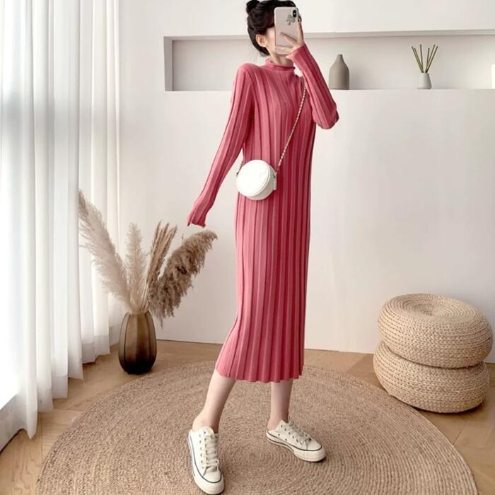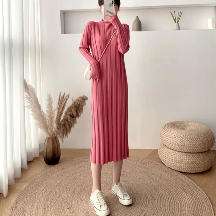 大きいサイズ ニット ワンピース リブ 袖あり レディース モックネック きれいめ カジュアル ミモレ丈 ハイネック 大人 可愛い フェミニン シンプル スリム スレンダー ナチュラル 体型カバー 韓国 ピンク ベージュ ブラック 黒 春 秋 冬 20代 30代 40代 50代