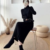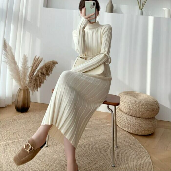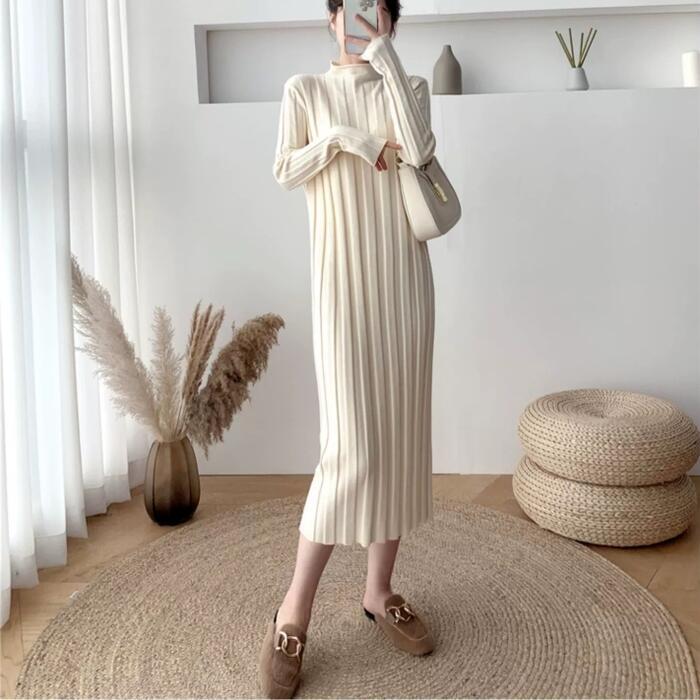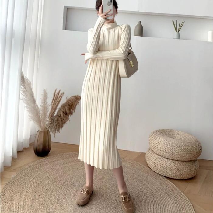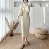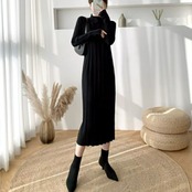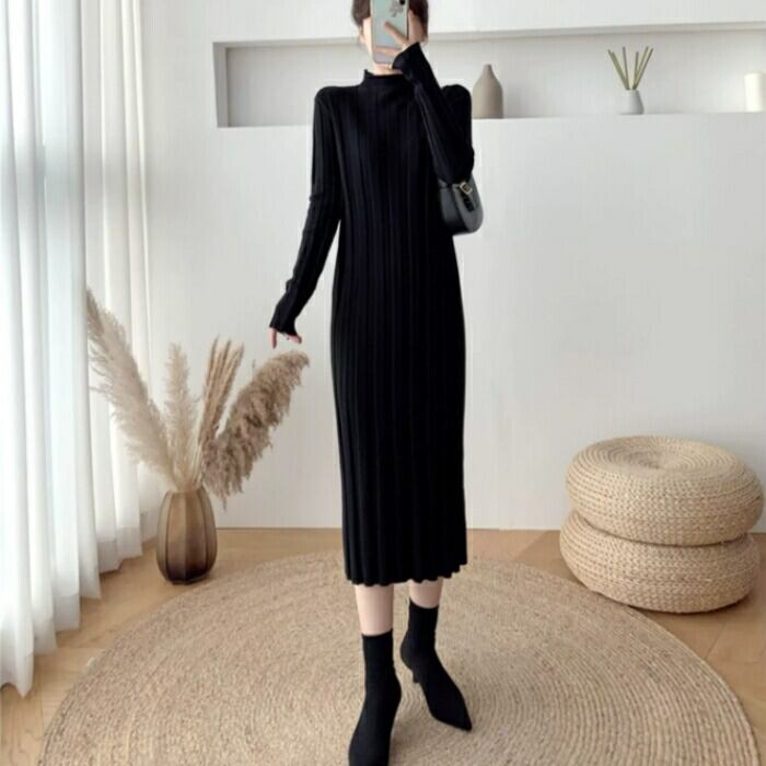 ぴったりとし過ぎないモックネックのリブニットワンピース。