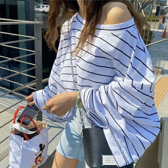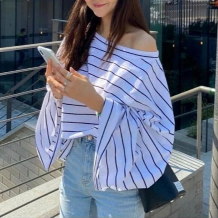 トップス Tシャツ カットソー プルオーバー レディース きれいめ カジュアル ボーダー 長袖 大人 可愛い フェミニン シンプル フレアスリーブ ゆったり オーバーサイズ おしゃれ 体型カバー ナチュラル 韓国 ホワイト 白 春 秋 冬 20代 30代 40代 50代