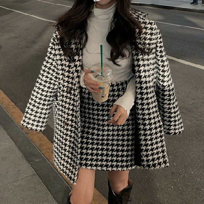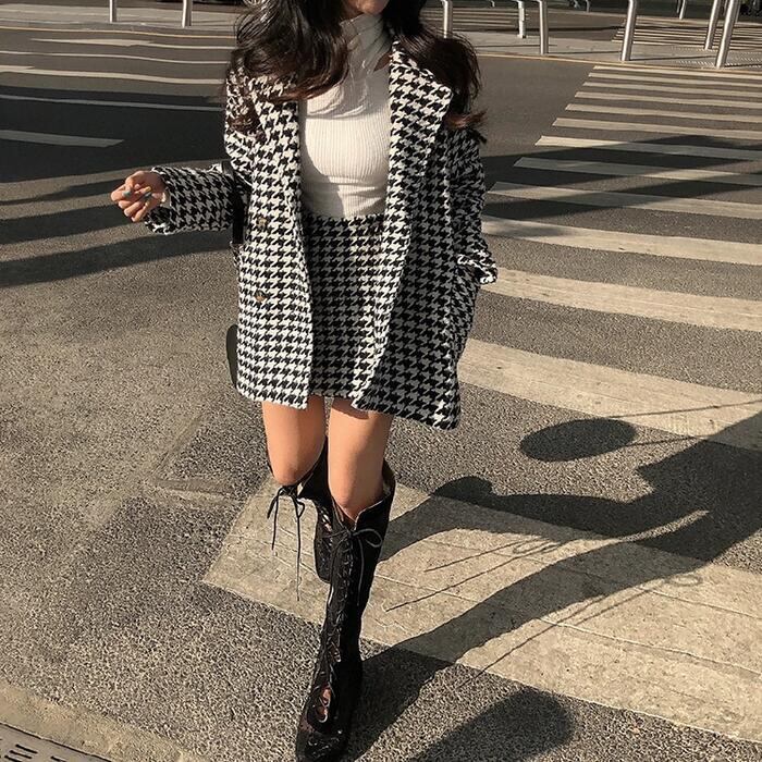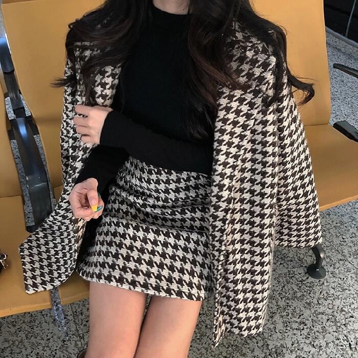 千鳥格子柄のジャケット&ミニスカートセットアップ。