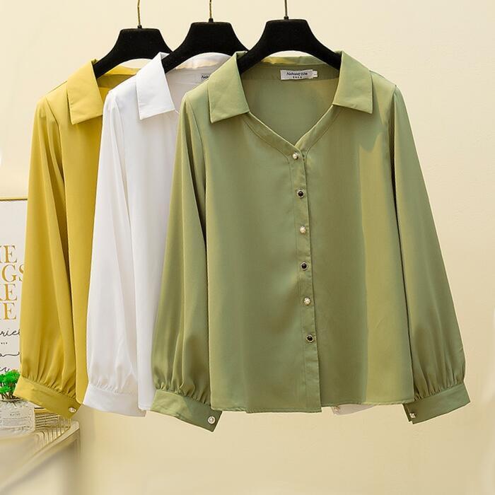 全3色 大きいサイズ トップス シャツ ブラウス レディース エレガント きれいめ カジュアル 長袖 大人 可愛い フェミニン シンプル Vネック ゆったり おしゃれ 体型カバー とろみ感 ナチュラル シフォン イエロー グリーン 緑 ホワイト 白 春 秋 冬 20代 30代 40代 50代