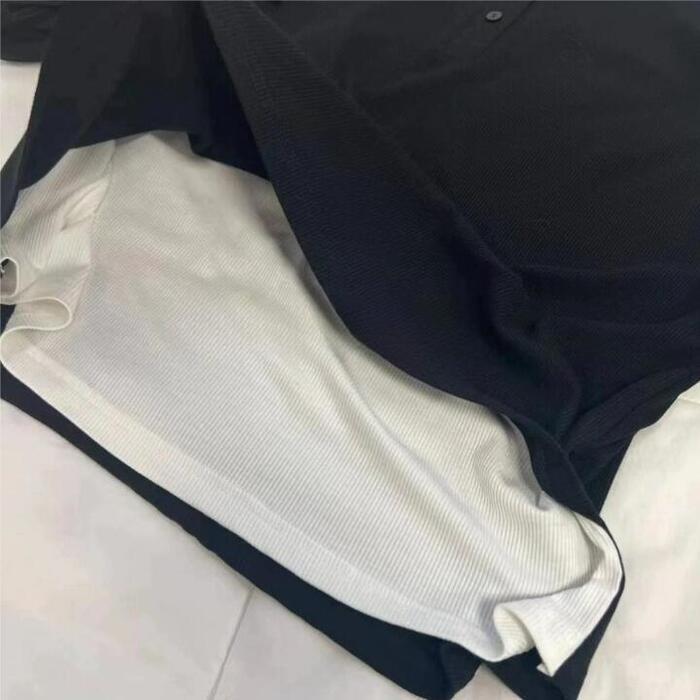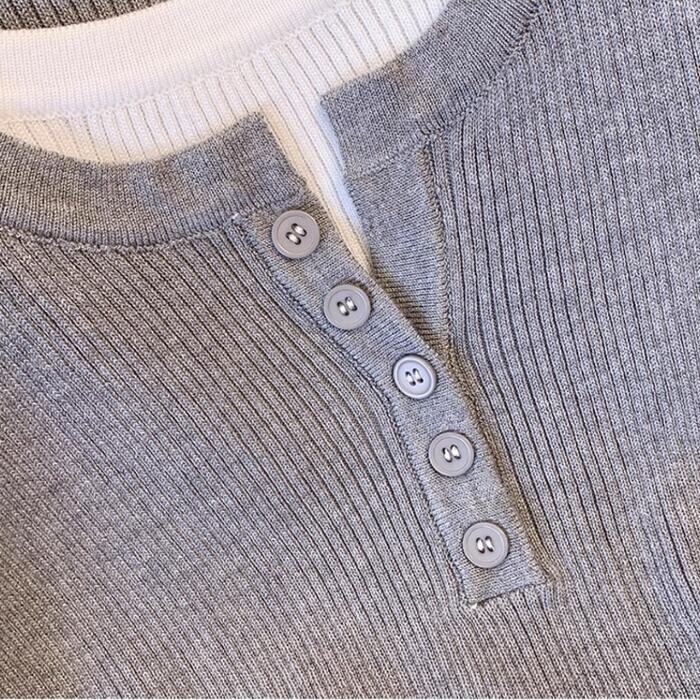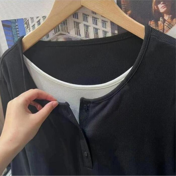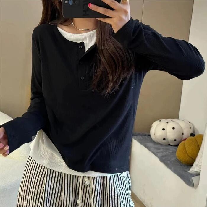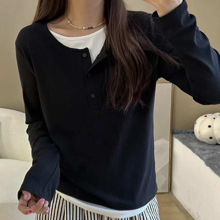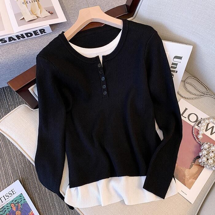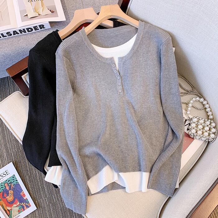 全2色 大きいサイズ レイヤード風 トップス ニット カットソー プルオーバー レディース きれいめ カジュアル 長袖 ヘンリーネック 大人 可愛い フェミニン クルーネック 重ね着 おしゃれ インナー 韓国 ブラック 黒 グレー 春 秋 冬 20代 30代 40代 50代