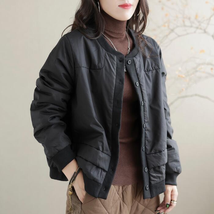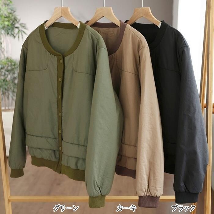 全3色 大きいサイズ 体型カバー アウター コート ジャケット ブルゾン レディース きれいめ カジュアル 長袖 ノーカラー 大人 可愛い フェミニン ショート丈 羽織り 中綿 おしゃれ ゆったり シンプル グリーン 緑 ベージュ ブラック 黒 春 秋 冬 20代 30代 40代 50代