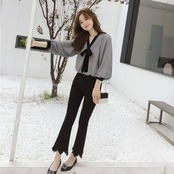ブラックのボウタイリボンがスタイリングを引き締めます。