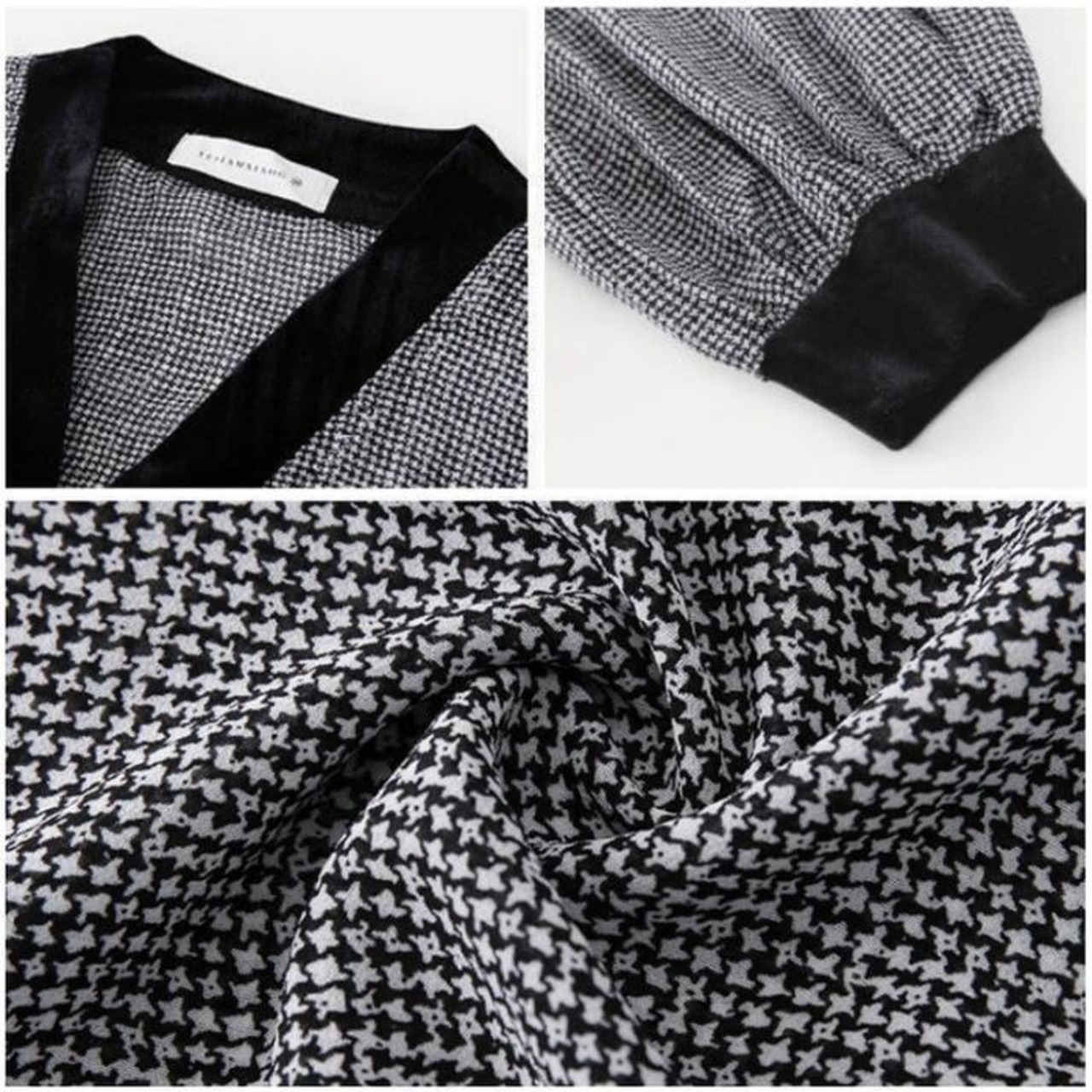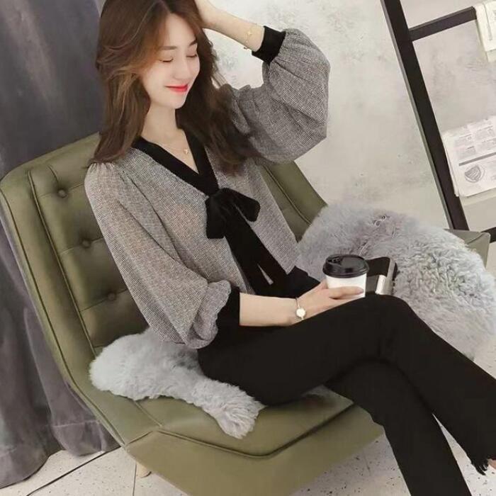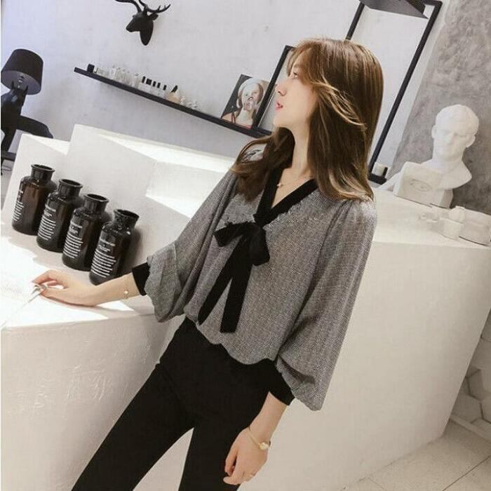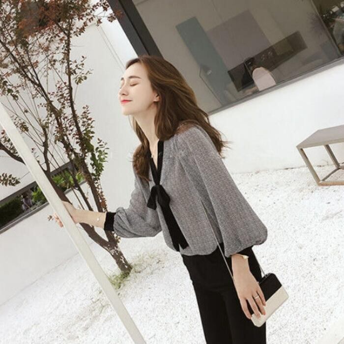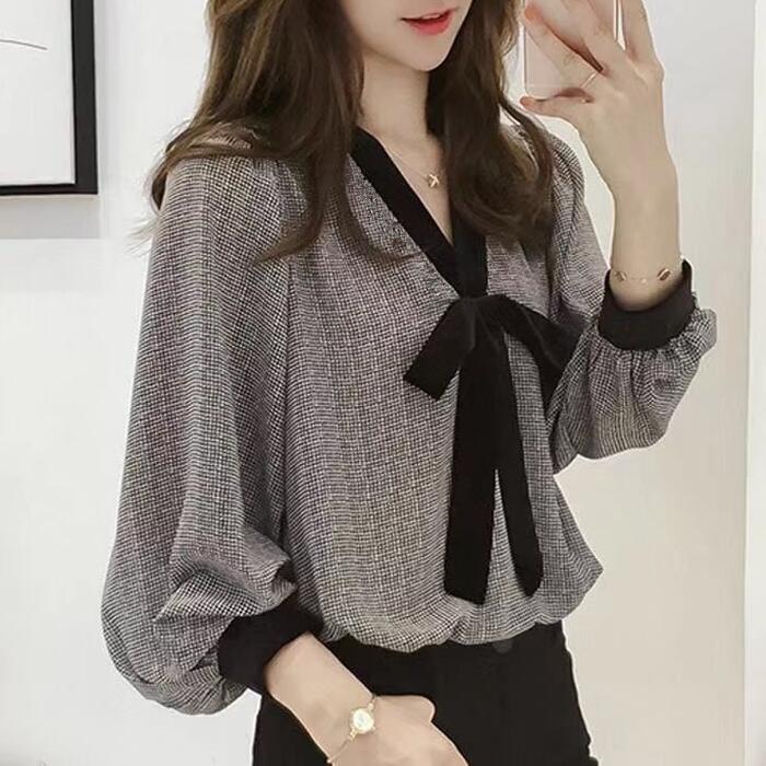 大きいサイズ トップス ブラウス シャツ ボウタイ リボン プルオーバー 千鳥格子 チェック レディース エレガント きれいめ カジュアル 長袖 Vネック 大人 可愛い フェミニン 透け感 おしゃれ 通勤 オフィス グレー 春 秋 冬 20代 30代 40代 50代