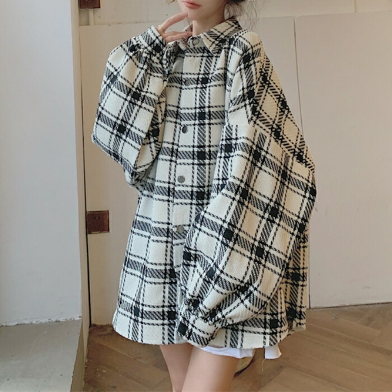 全2色 トップス ブラウス シャツ レディース チェック カジュアル 長袖 ビッグシルエット オーバーサイズ 大人 可愛い フェミニン ゆったり 体型カバー おしゃれ 羽織り アウター ジャケット 韓国 ホワイト 白 ブラック 黒 春 秋 冬 20代 30代 40代 50代