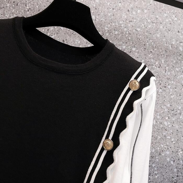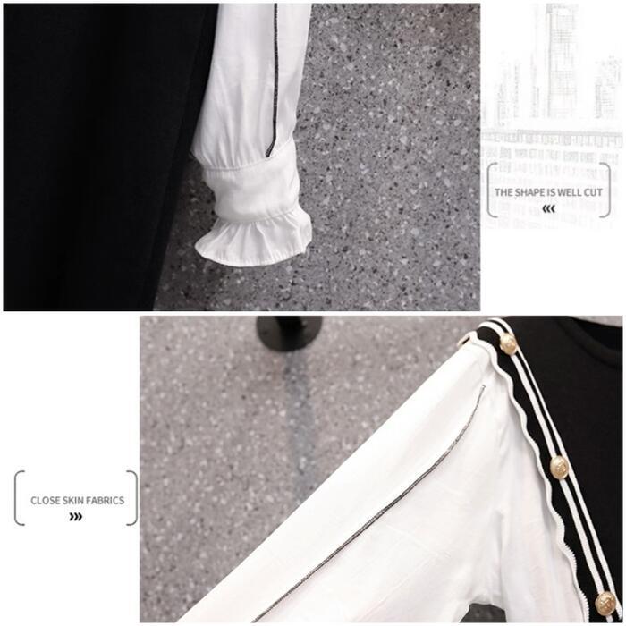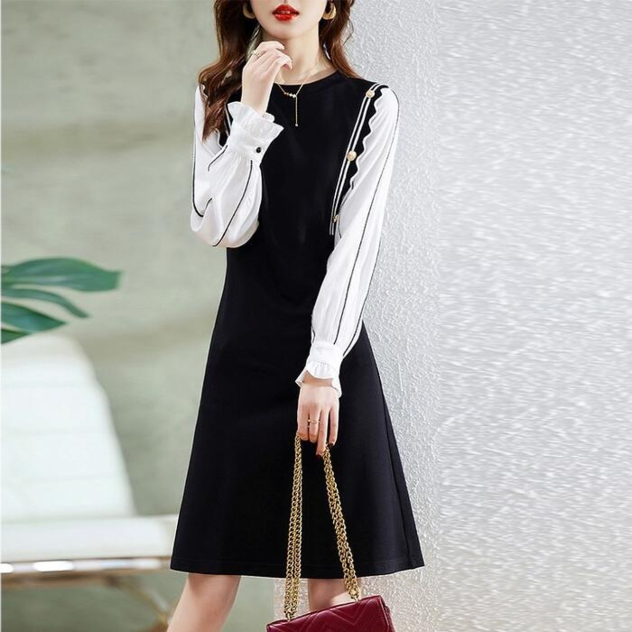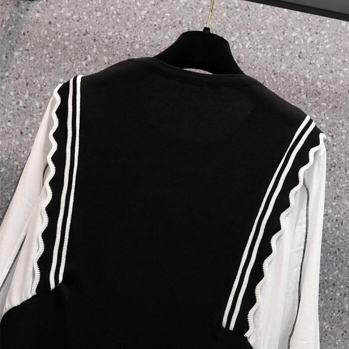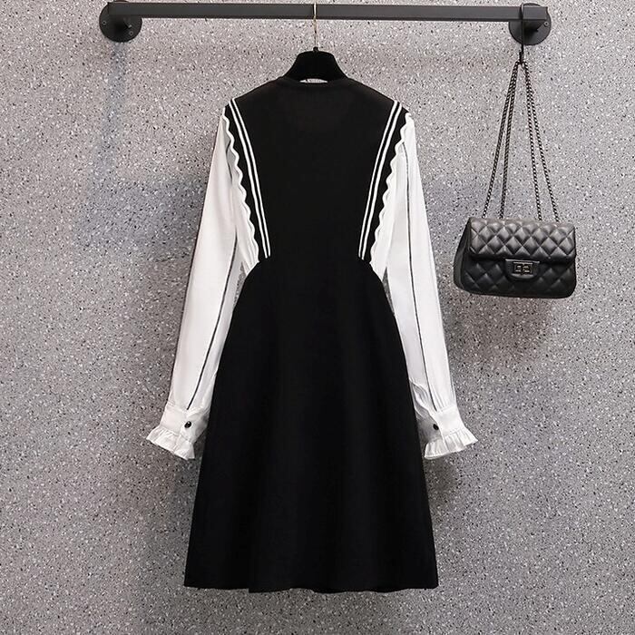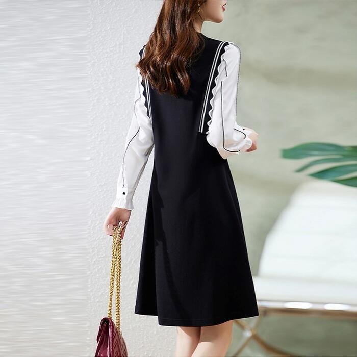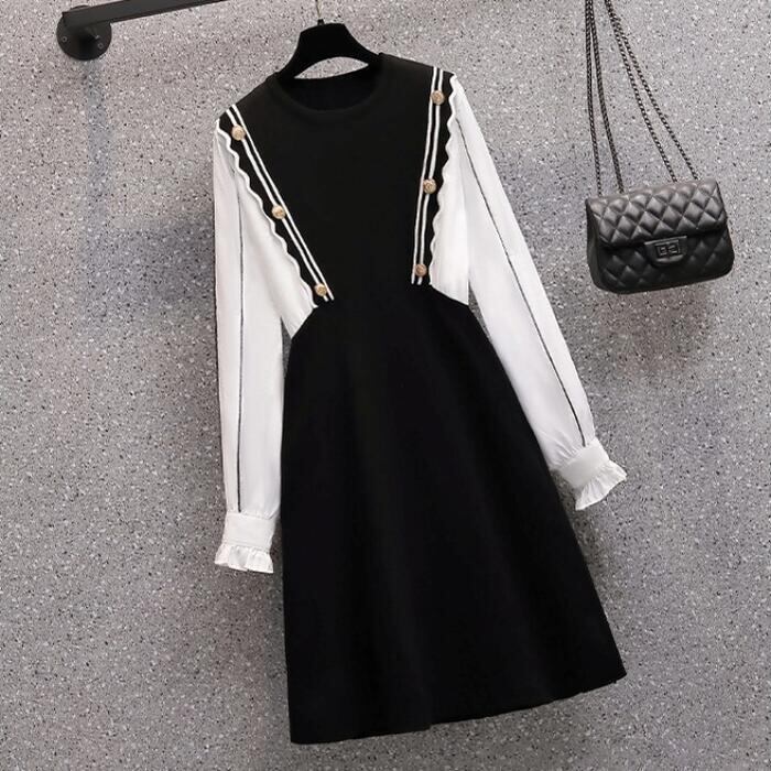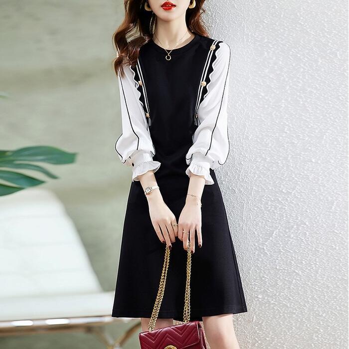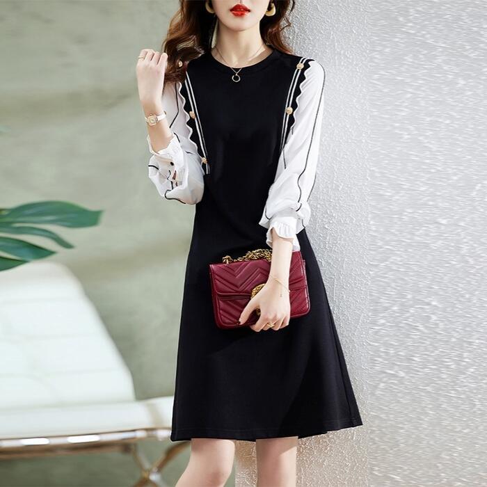 大きいサイズ 体型カバー Aライン ワンピース ドレス ニット 異素材ミックス ワンピ ドッキング 袖あり レディース きれいめ カジュアル ミモレ丈 長袖 大人 可愛い フェミニン レイヤード風 切り替え バイカラー ハイウエスト ブラック 黒 春 秋 冬 20代 30代 40代 50代