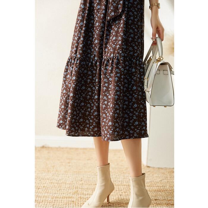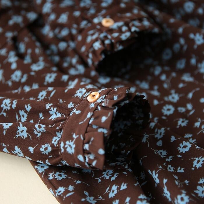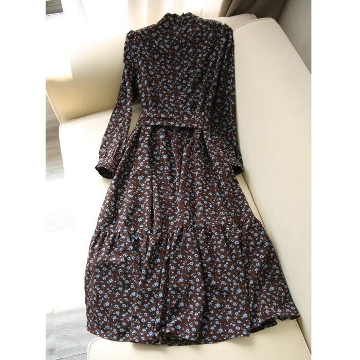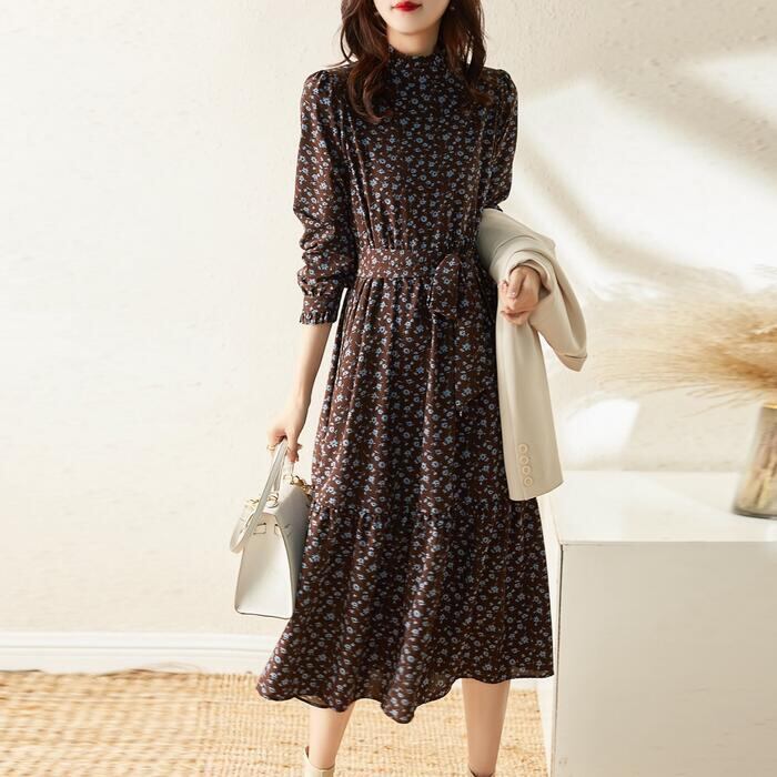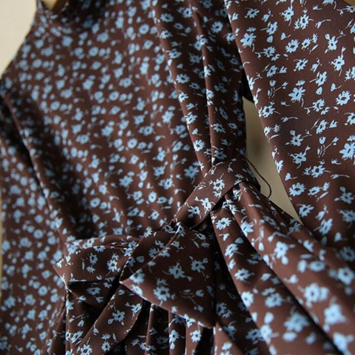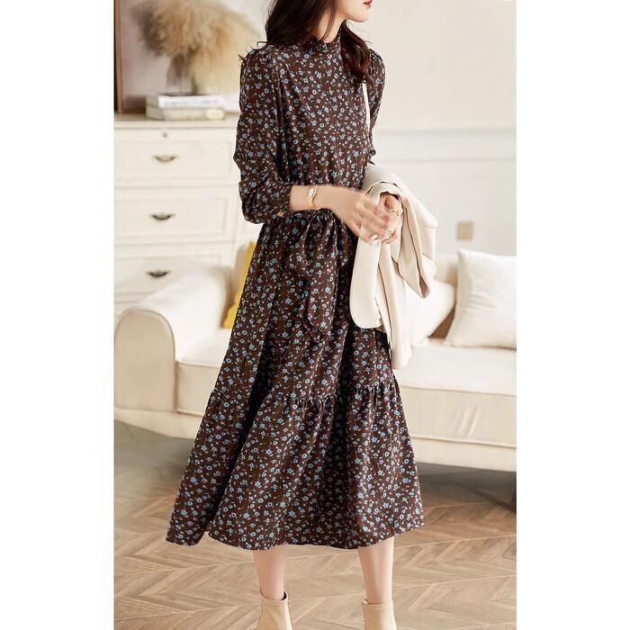 大きいサイズ 体型カバー ワンピース ドレス 小花柄 フラワー ワンピ 袖あり レディース エレガント きれいめ カジュアル ミモレ丈 長袖 大人 可愛い フェミニン ウエストリボン フリル スタンドカラー クラシカル Aライン ブラウン 春 秋 冬 20代 30代 40代 50代