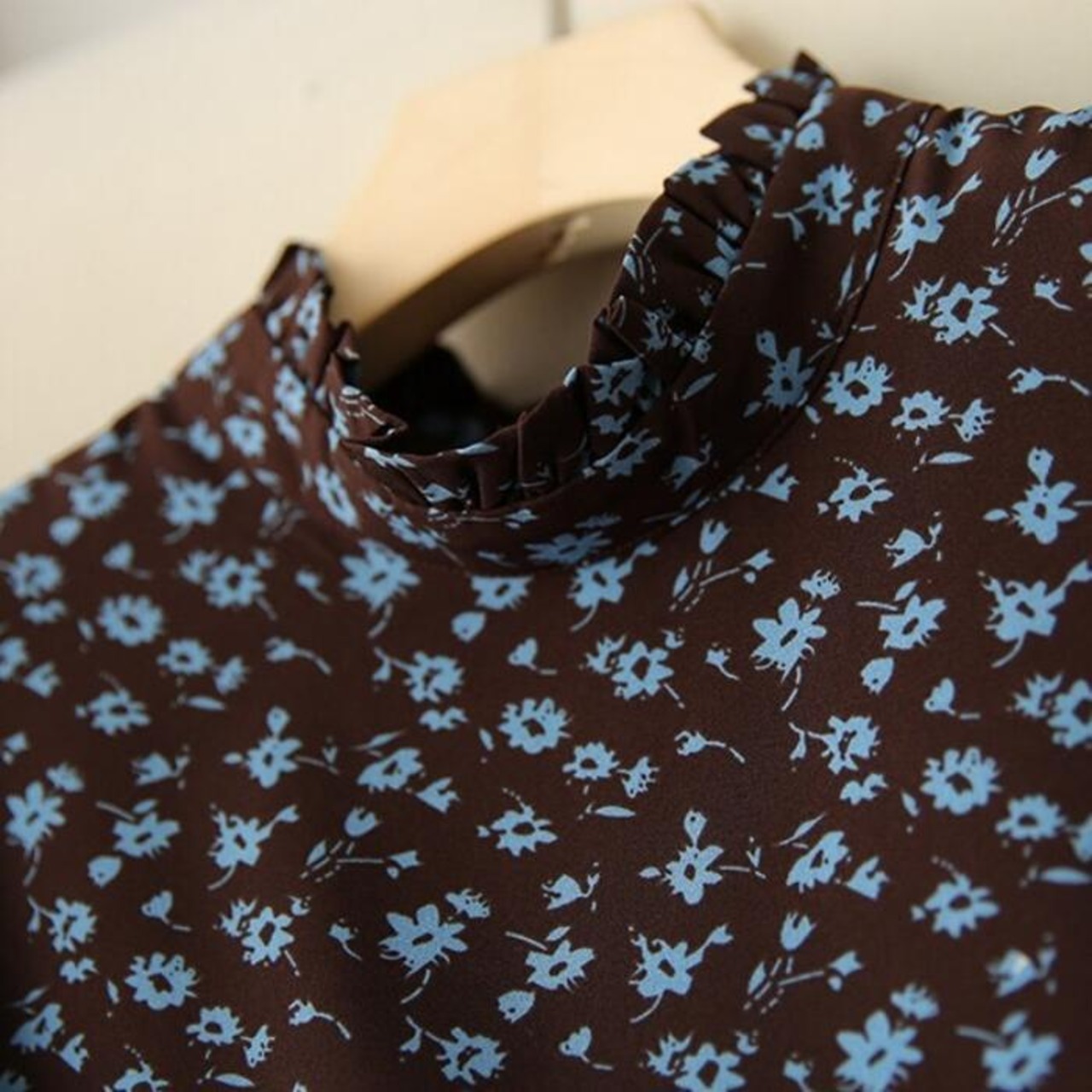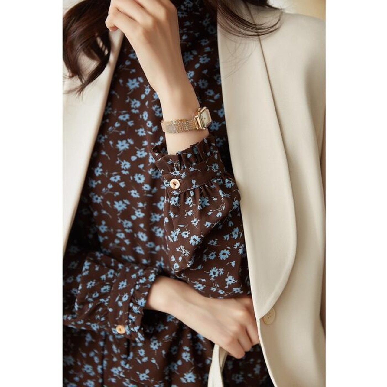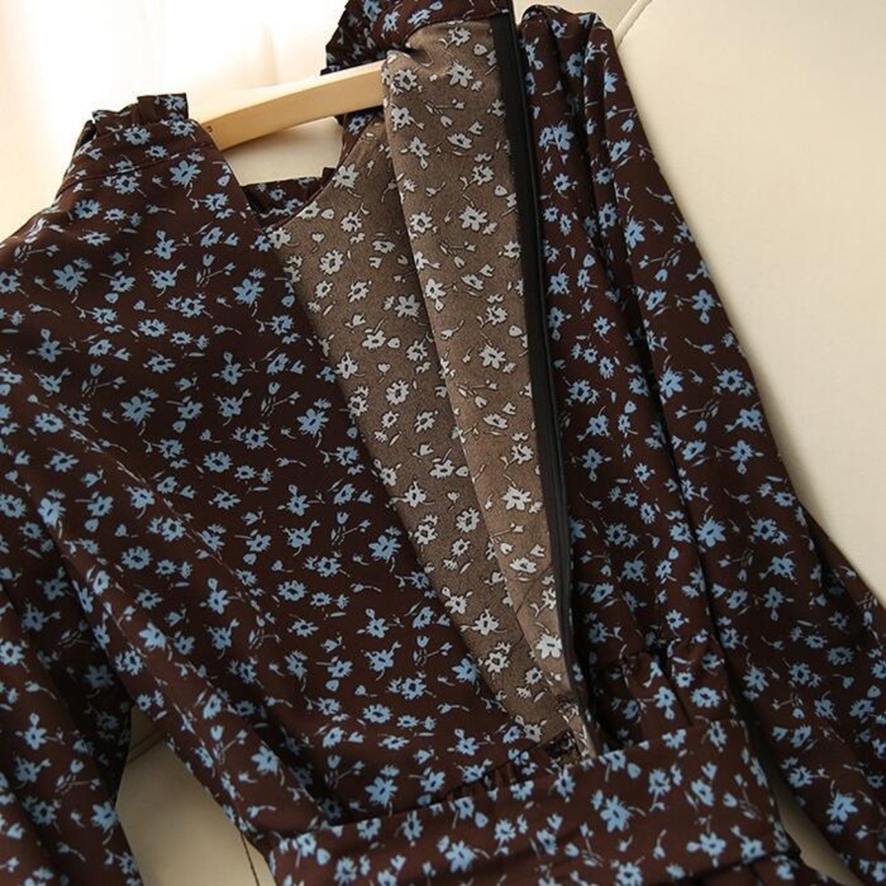 大きいサイズ 体型カバー ワンピース ドレス 小花柄 フラワー ワンピ 袖あり レディース エレガント きれいめ カジュアル ミモレ丈 長袖 大人 可愛い フェミニン ウエストリボン フリル スタンドカラー クラシカル Aライン ブラウン 春 秋 冬 20代 30代 40代 50代