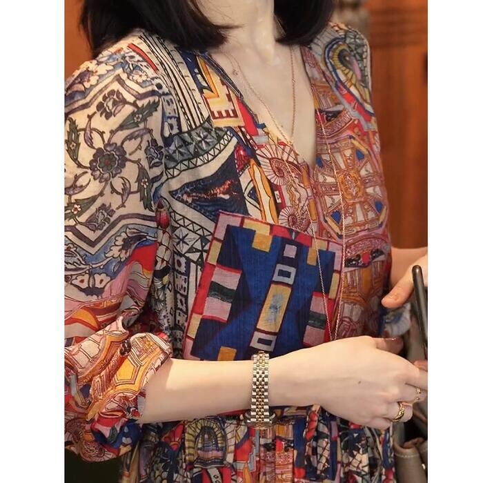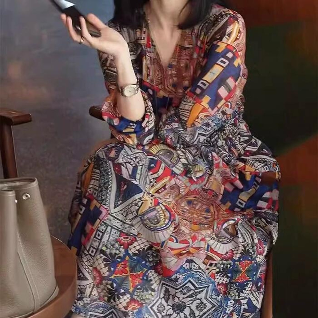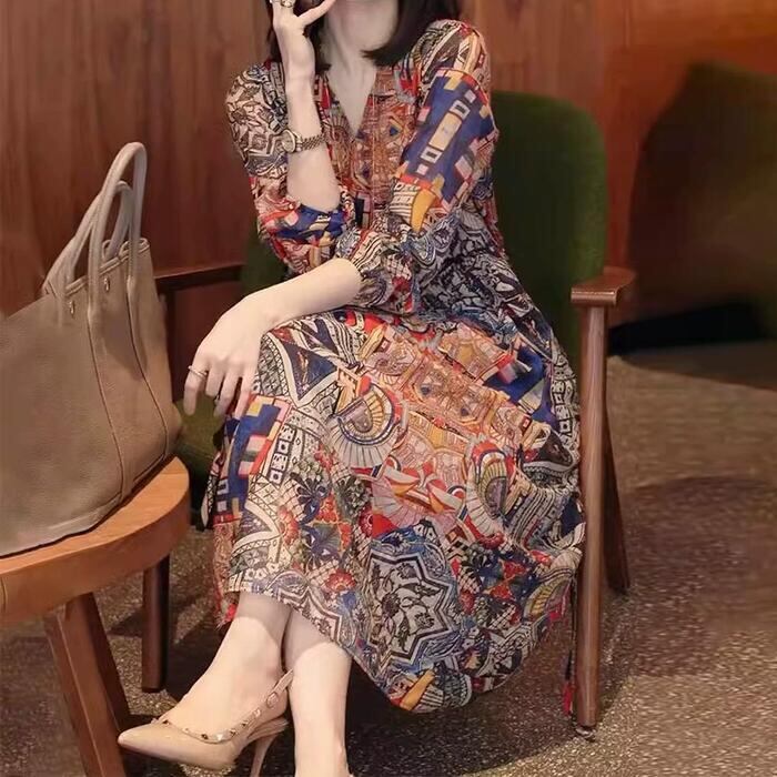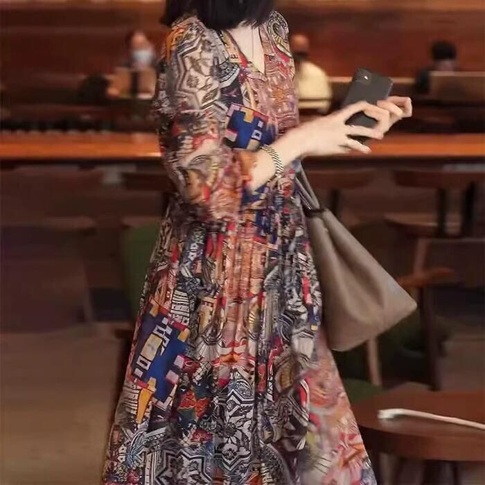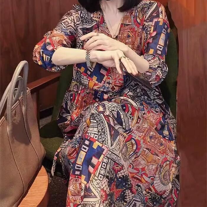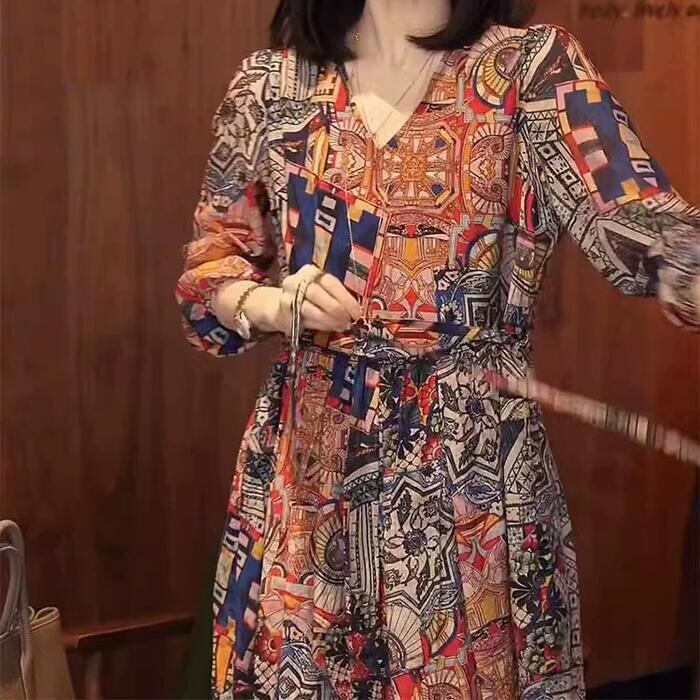 大きいサイズ 体型カバー ワンピース ドレス プリント ワンピ 袖あり レディース エレガント きれいめ カジュアル ミモレ丈 長袖 大人 可愛い フェミニン Vネック シフォン クラシカル Aライン ジオメトリック ウエストリボン マルチカラー 春 秋 冬 20代 30代 40代 50代