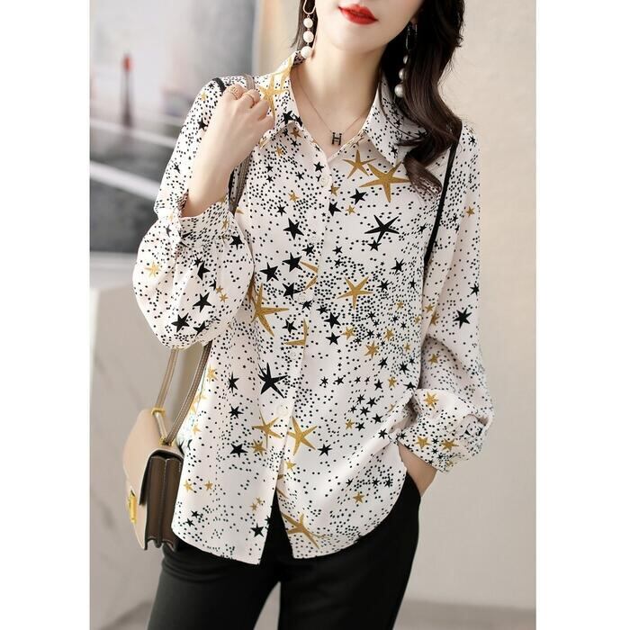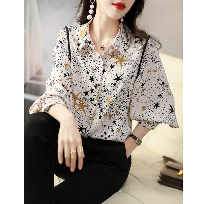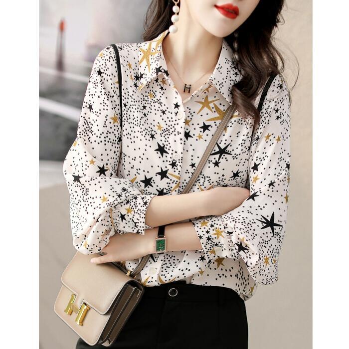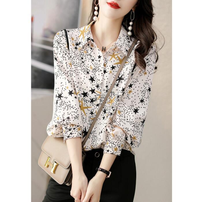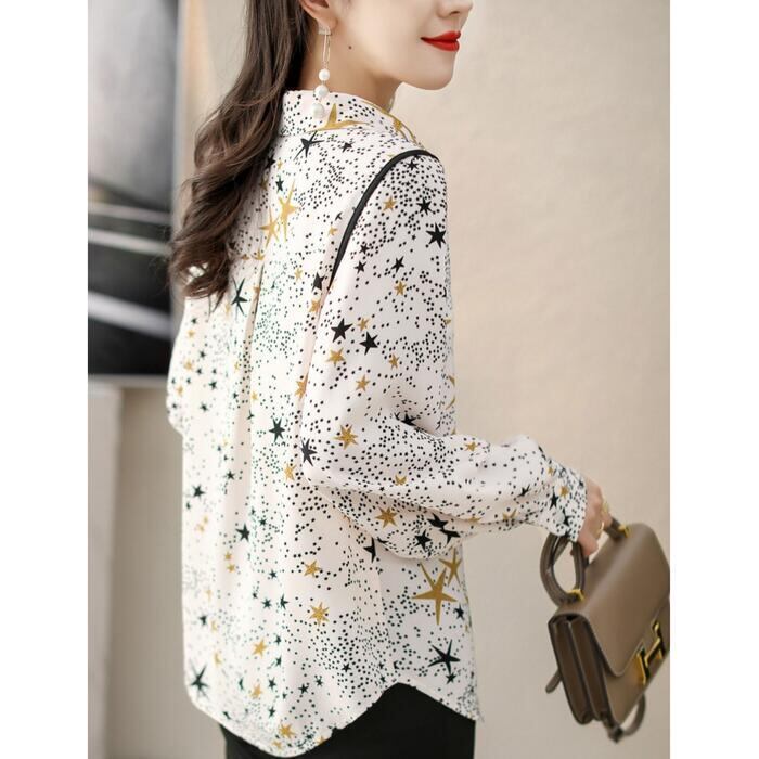 トップス シャツ ブラウス 星柄 スター プリント レディース エレガント きれいめ カジュアル 長袖 大人 可愛い フェミニン おしゃれ シフォン 上品 通勤 オフィス 大きいサイズ 体型カバー ホワイト 白 春 秋 冬 20代 30代 40代 50代