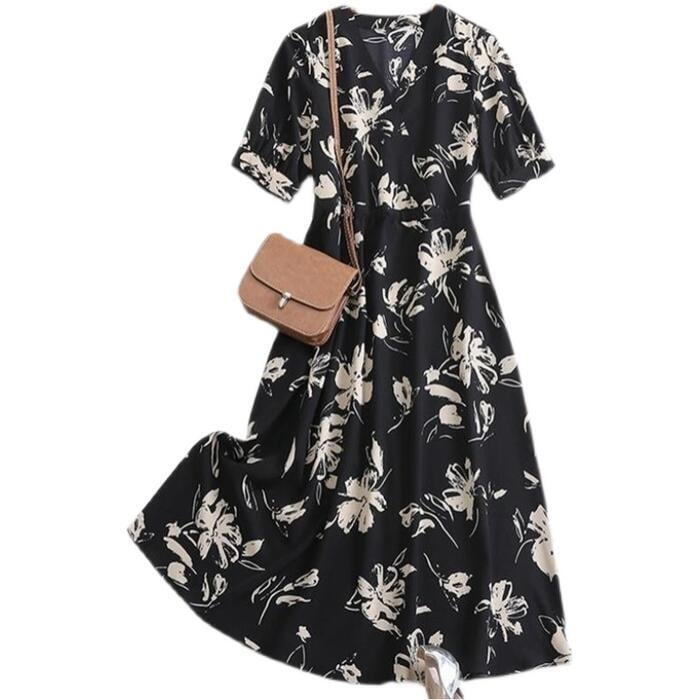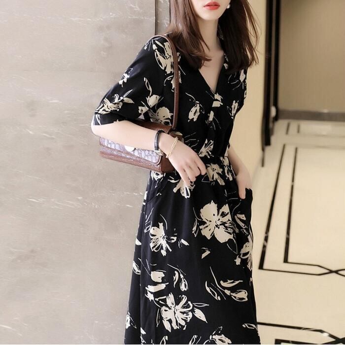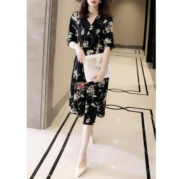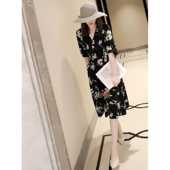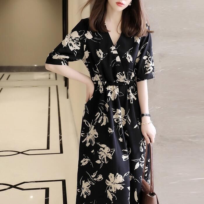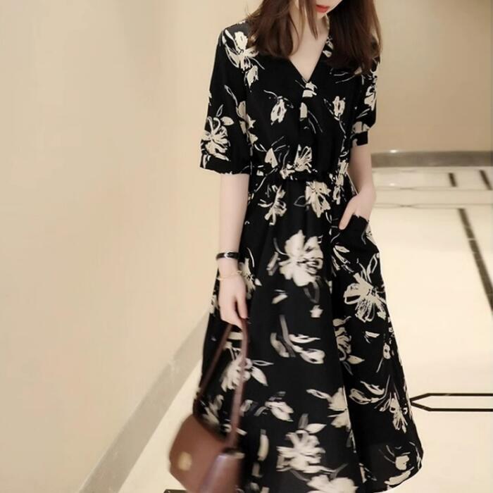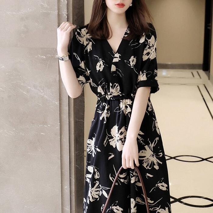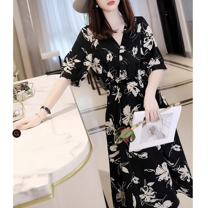 大きいサイズ 体型カバー ワンピース ドレス ワンピ 花柄 フラワー 袖あり レディース エレガント きれいめ カジュアル ミモレ丈 半袖 大人 可愛い フェミニン ハイウエスト Aライン カシュクール Vネック お呼ばれ ブラック 黒 春 秋 夏 20代 30代 40代 50代