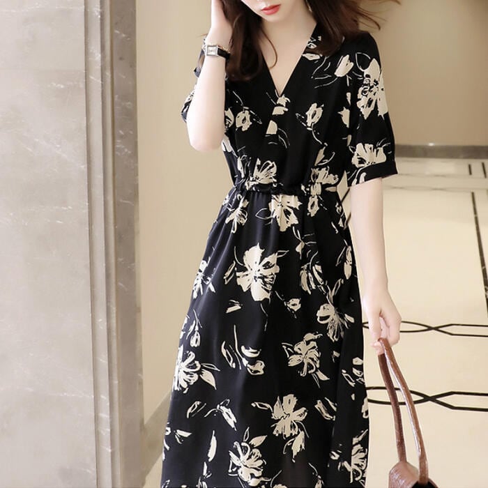 シックで程よく華やかな大人可愛い花柄ワンピース。