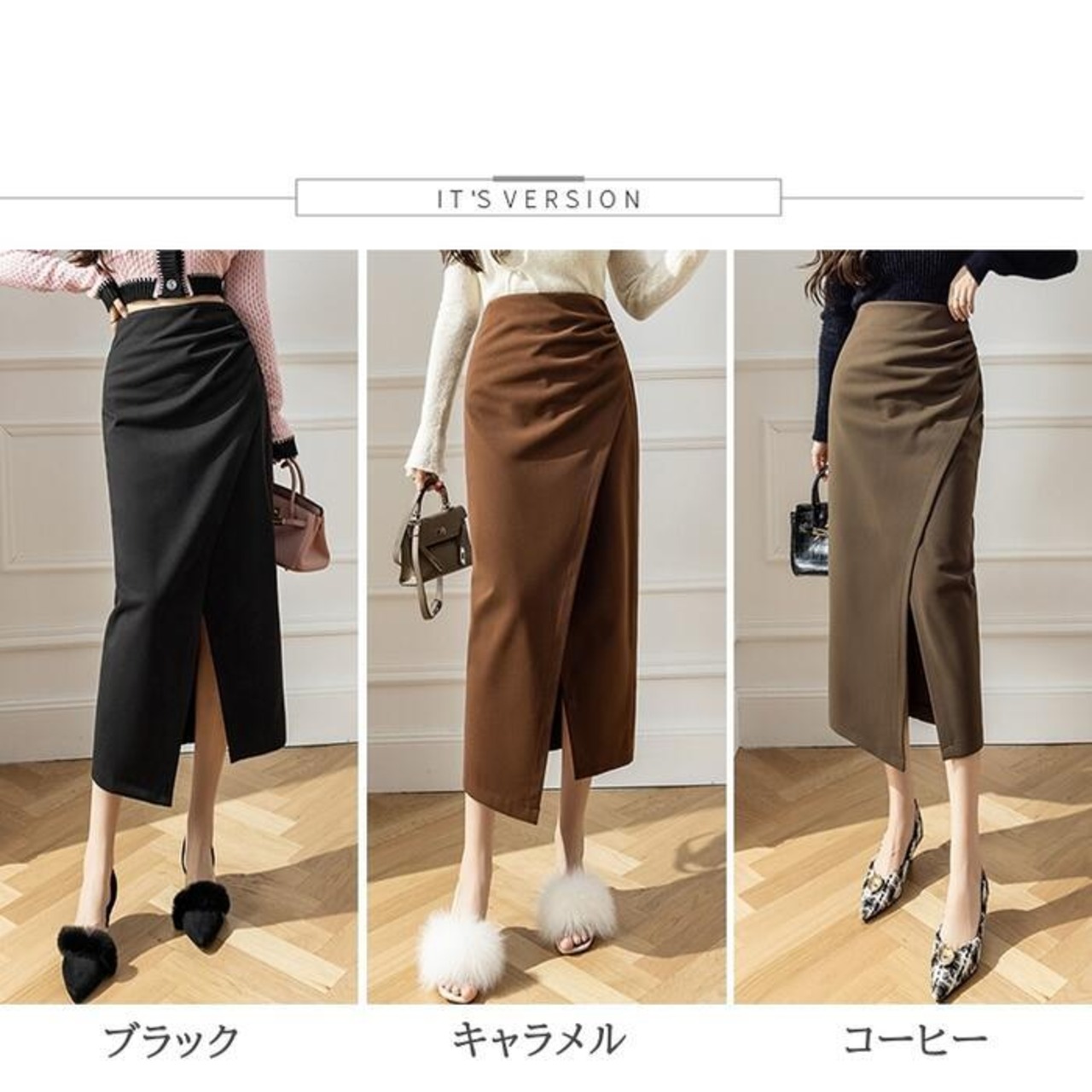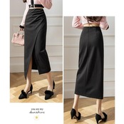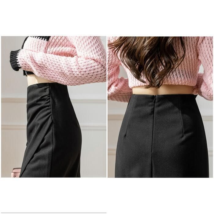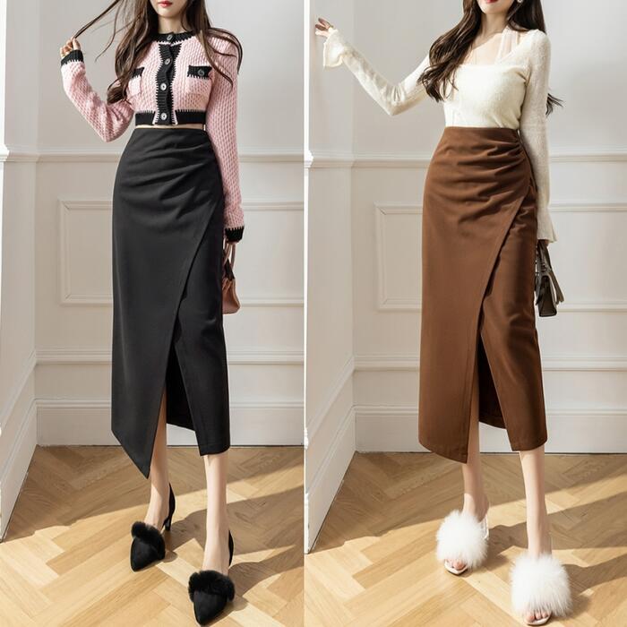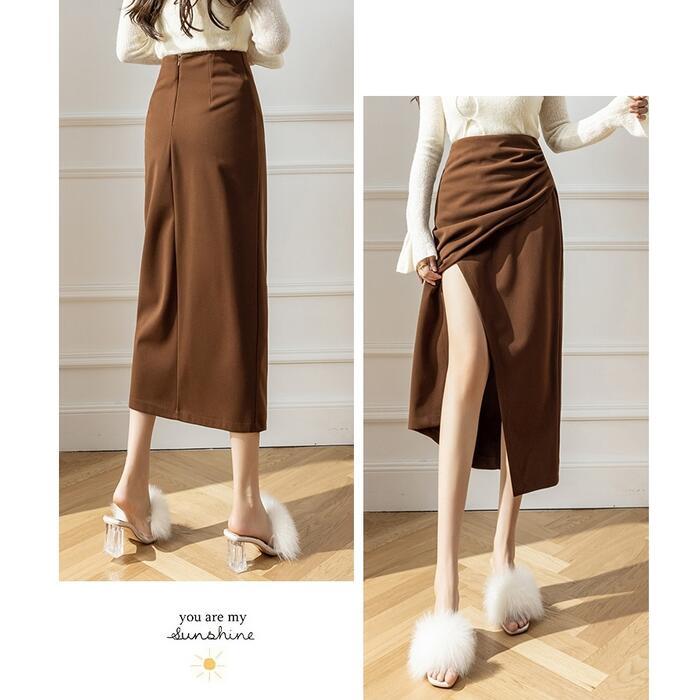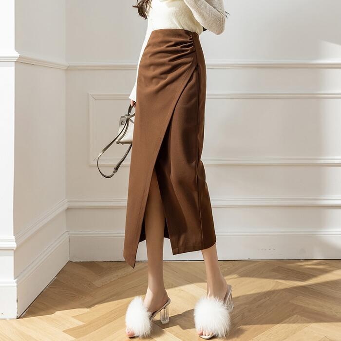 全3色 大きいサイズ ボトムス スカート タイト スリット レディース エレガント きれいめ カジュアル ミモレ丈 大人 可愛い フェミニン ハイウエスト 体型カバー 美脚 シンプル ギャザー ブラウン ブラック 黒 ベージュ 春 冬 秋 20代 30代 40代 50代