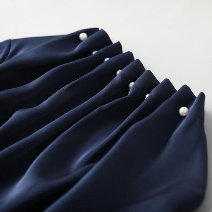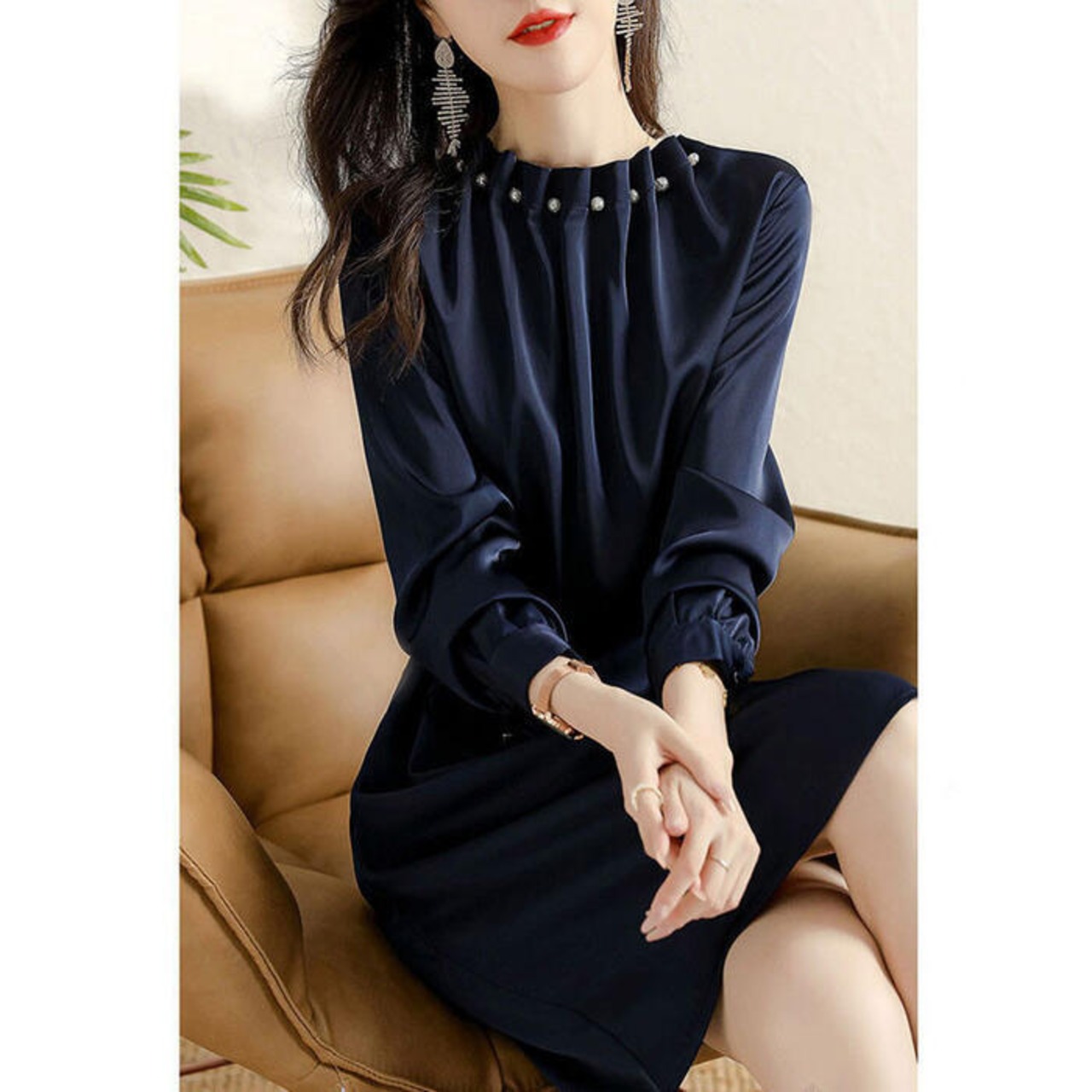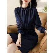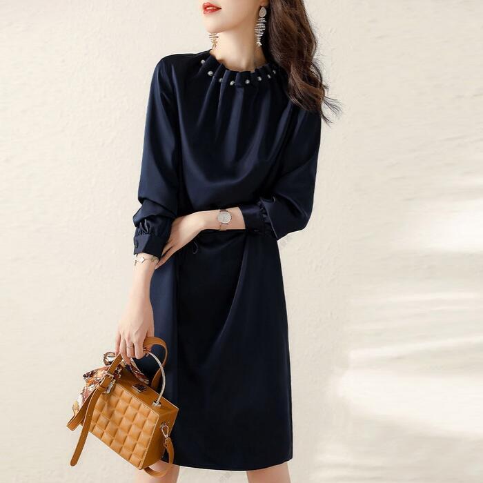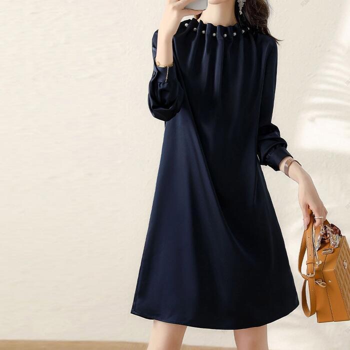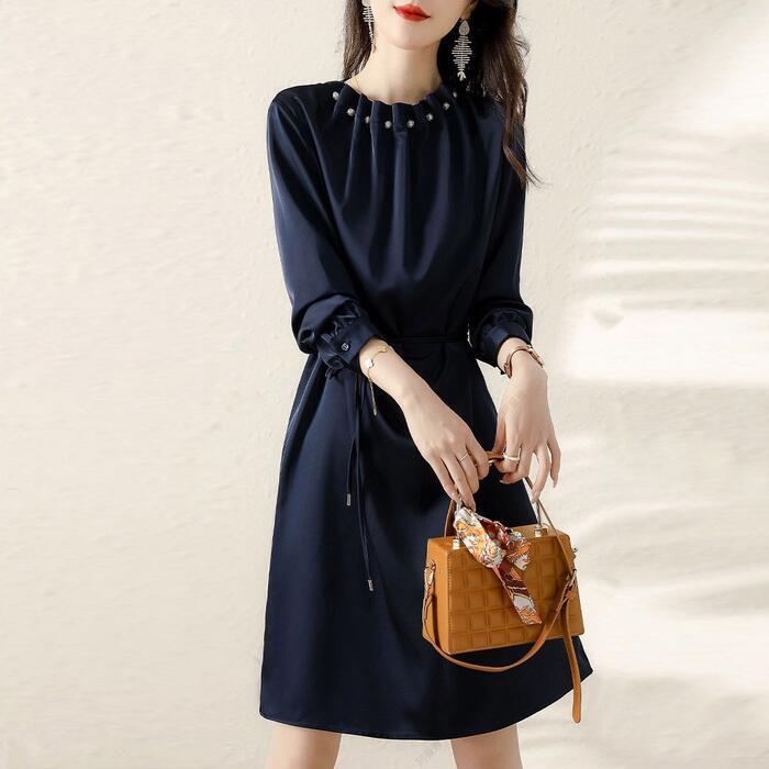 大きいサイズ ワンピース ドレス ワンピ 袖あり パール ドレープ レディース エレガント きれいめ カジュアル ひざ丈 長袖 大人 可愛い フェミニン ゆったり 体型カバー Aライン 上品 お呼ばれ オケージョン ネイビー 春 秋 冬 20代 30代 40代 50代