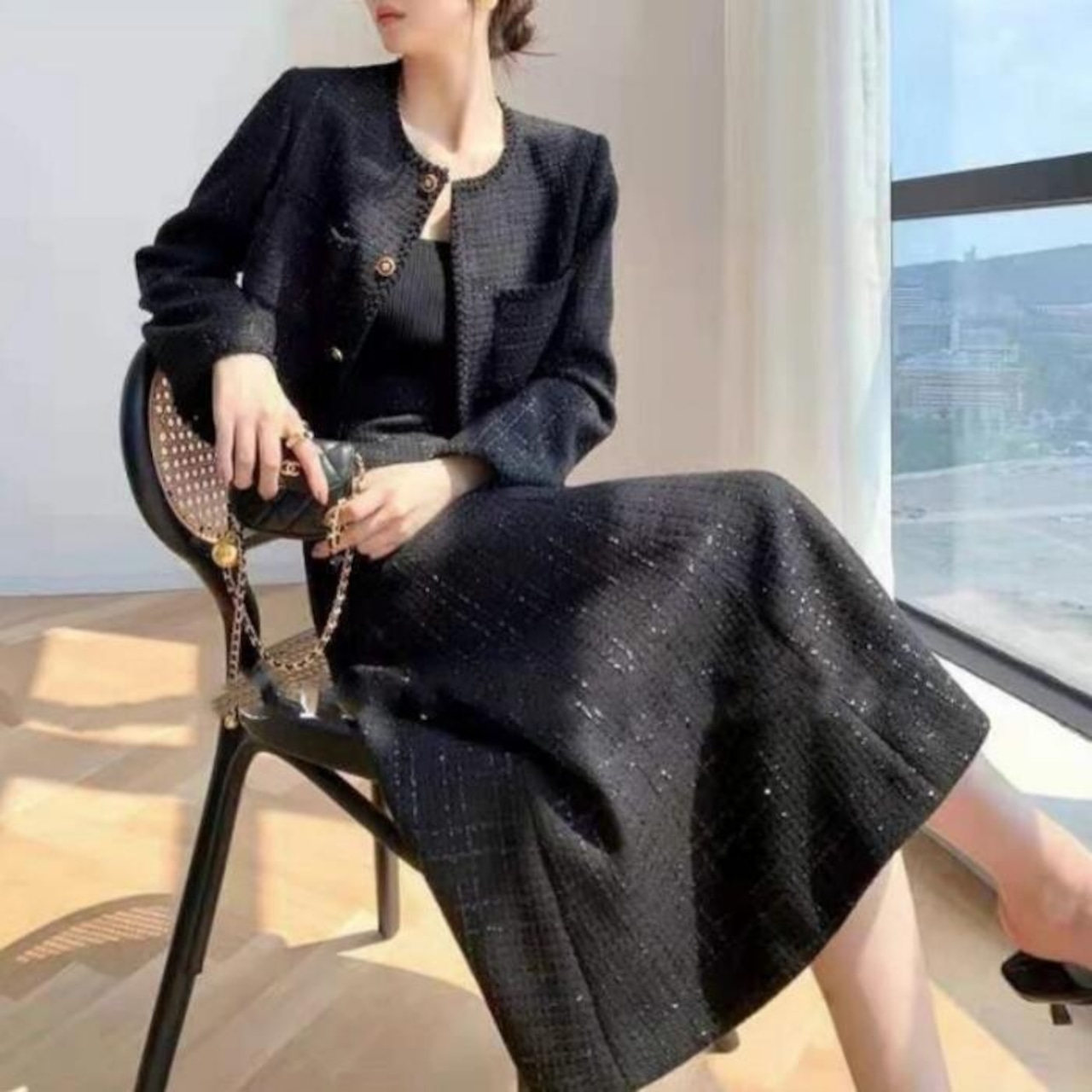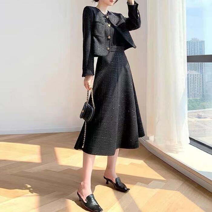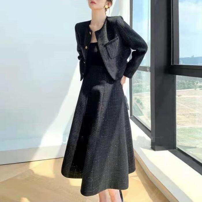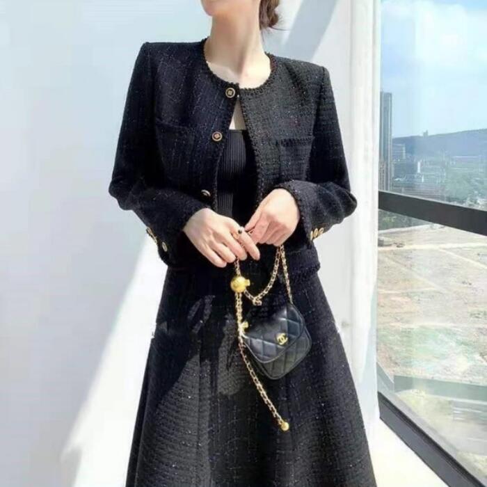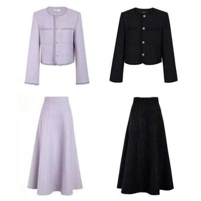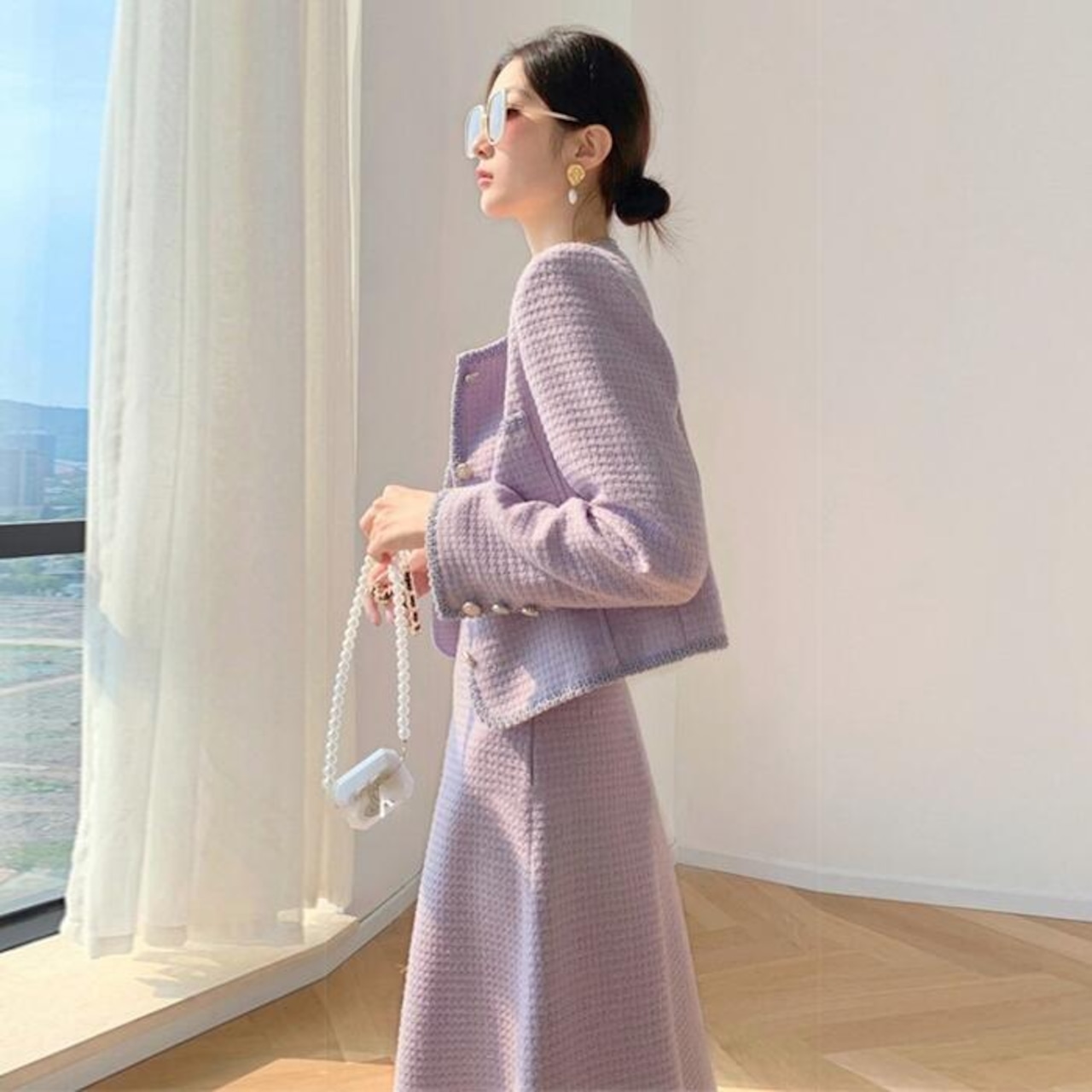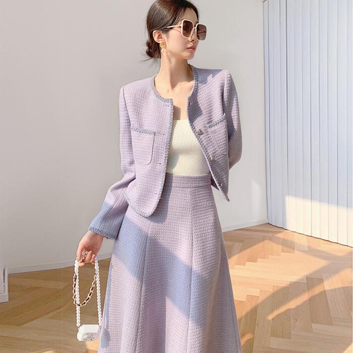ノーカラージャケット&ミモレ丈スカートのツイードセットアップ。