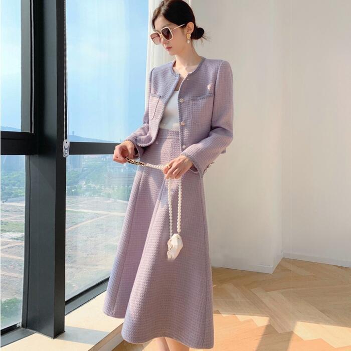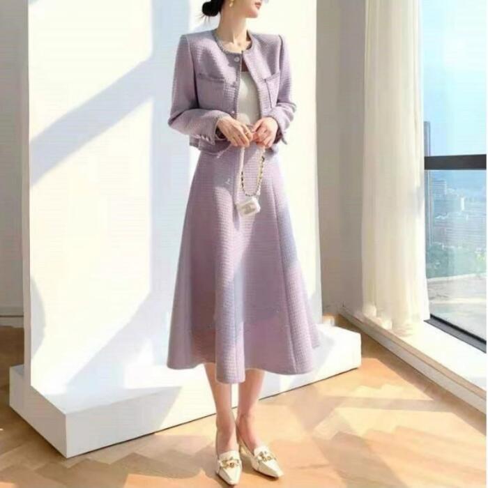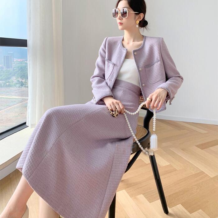 全2色 大きいサイズ おしゃれ 入学式 ママスーツ レディース ノーカラー ツイード ジャケット スカート ミモレ丈 卒業式 母 卒園式 入園式 セレモニー 七五三 お宮参り 母親 ママ 長袖 大人可愛い カジュアル フォーマル オフィス パープル ブラック 黒 春 秋 冬 20代 30代 40代 50代